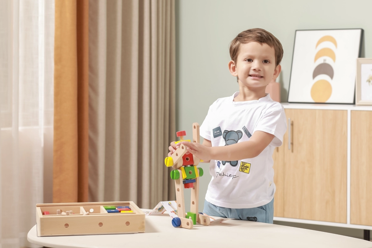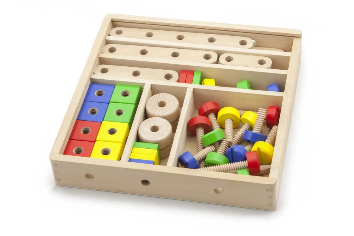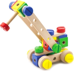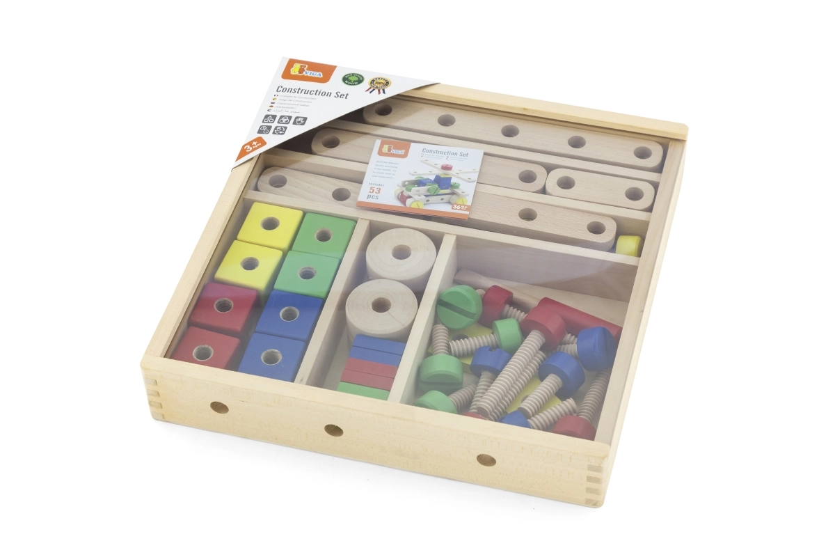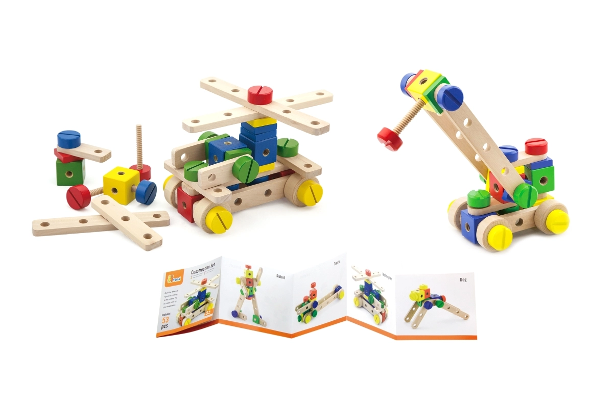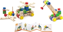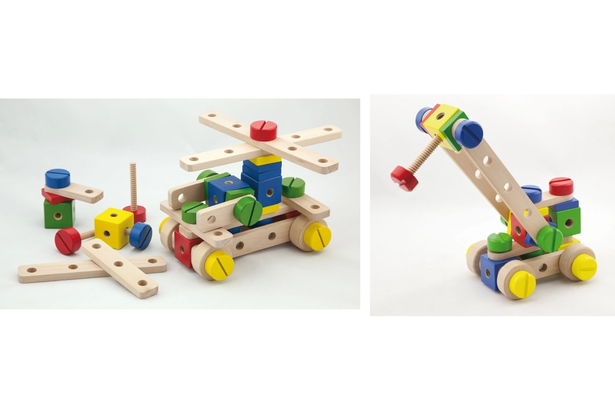 Este juego de construcción de madera de alta calidad ofrece a los niños posibilidades infinitas de creación. Gracias a sus 53 piezas de colores, pasadores, tornillos y conectores, construirán con facilidad modelos sencillos y estructuras imaginativas. Incluye un claro folleto ilustrado que inspira y guía paso a paso los primeros proyectos.