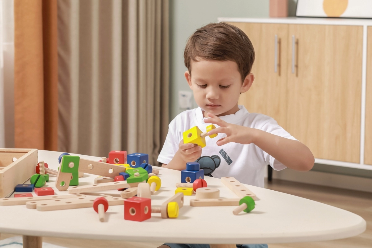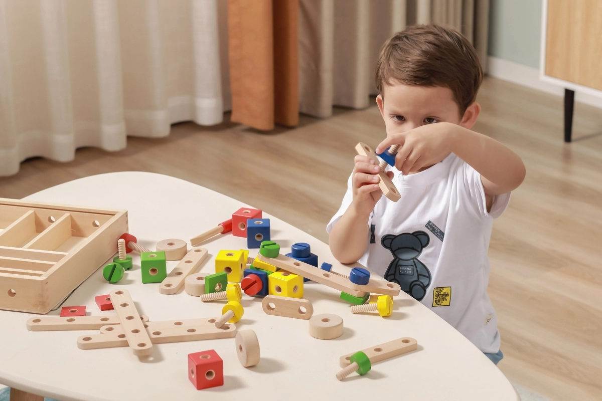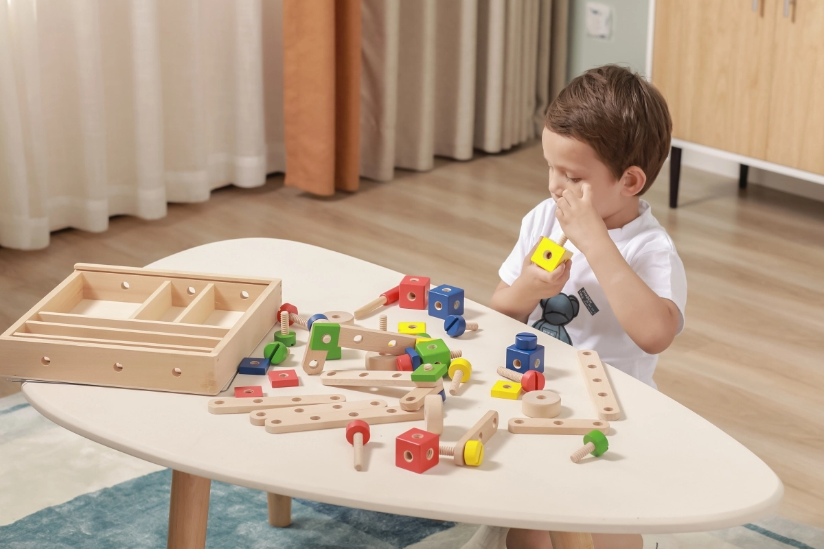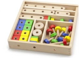 El set desarrolla la motricidad fina, la coordinación ojo–mano y el pensamiento lógico y espacial. La madera natural combinada con colores vivos invita a jugar y aprender de forma divertida. Todo se guarda de forma ordenada en una caja con tapa transparente para recoger fácilmente y tener siempre las piezas a mano.