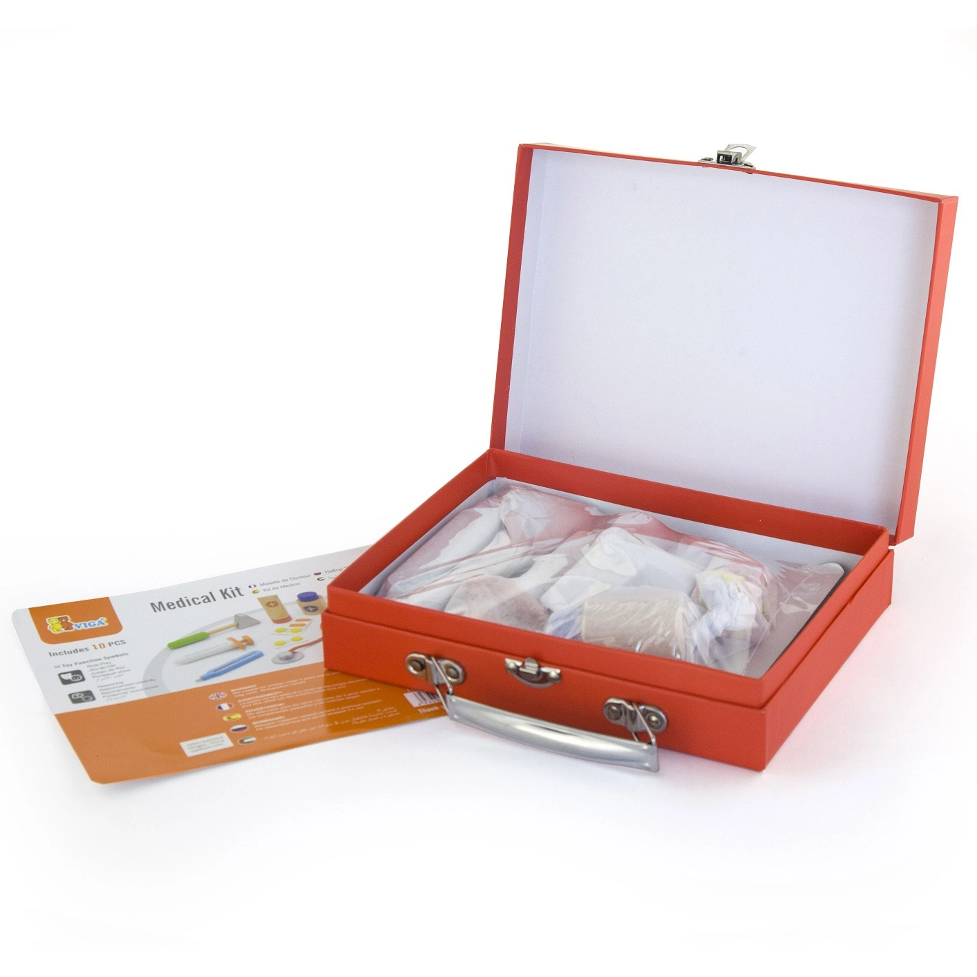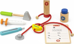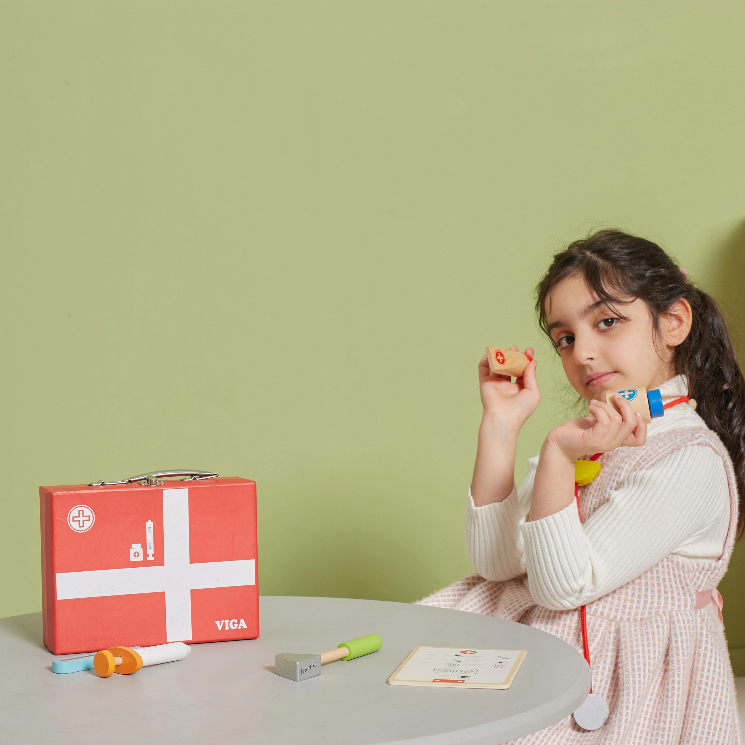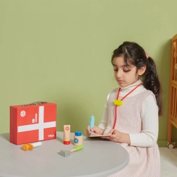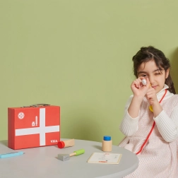 Este hermoso juego médico en un resistente maletín de madera encantará a todos los pequeños doctores y doctoras. Los niños pueden escuchar el corazoncito con el estetoscopio, “medir” la temperatura con el termómetro, poner una inyección o rellenar la ficha del paciente para sus peluches y muñecas. Jugar a los médicos es una divertida actividad de juego de roles que desarrolla las habilidades sociales, la sensibilidad y la empatía.