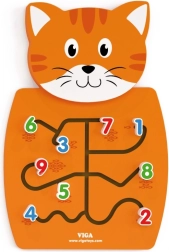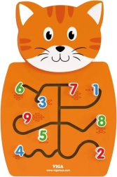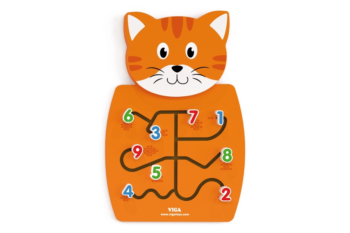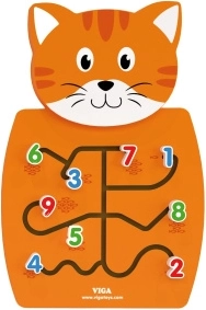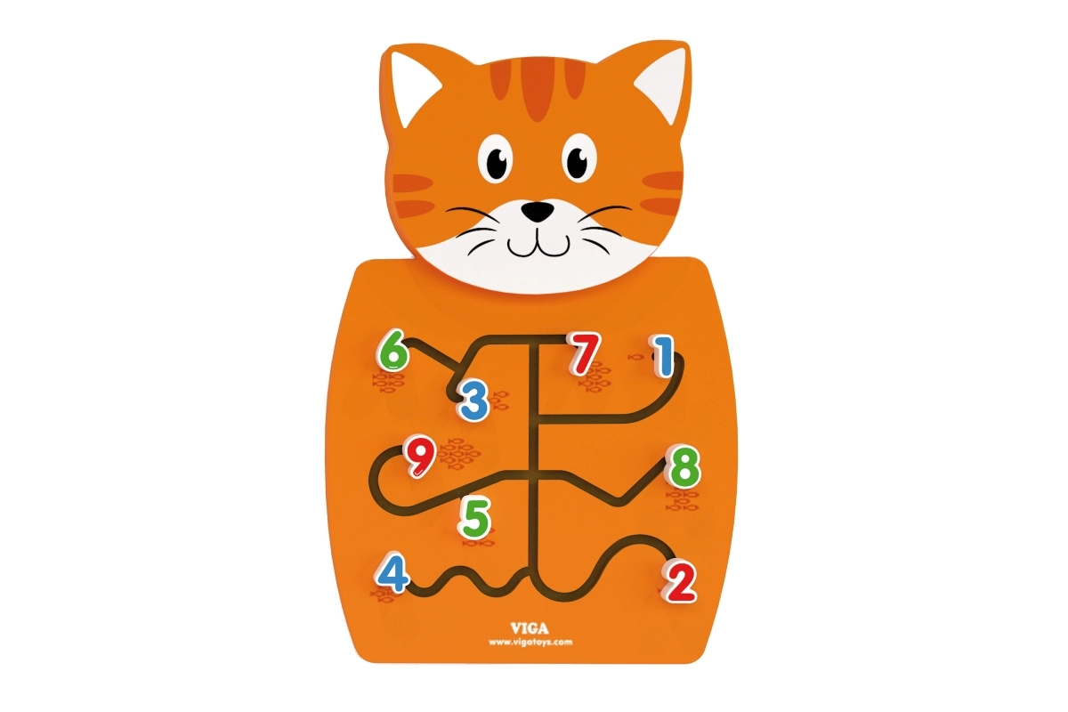 Gato de madera con laberintos para mover números y desarrollar la motricidad fina.
