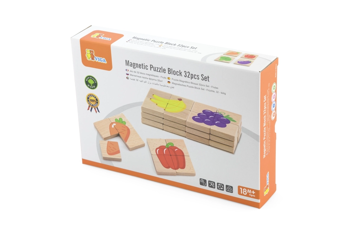 El set incluye un total de 32 piezas magnéticas, fáciles de agarrar y manipular. Las ilustraciones de frutas son coloridas y estimularán la imaginación de tu hijo.