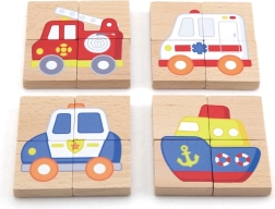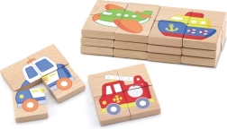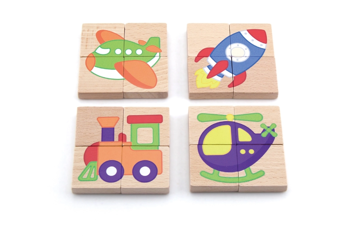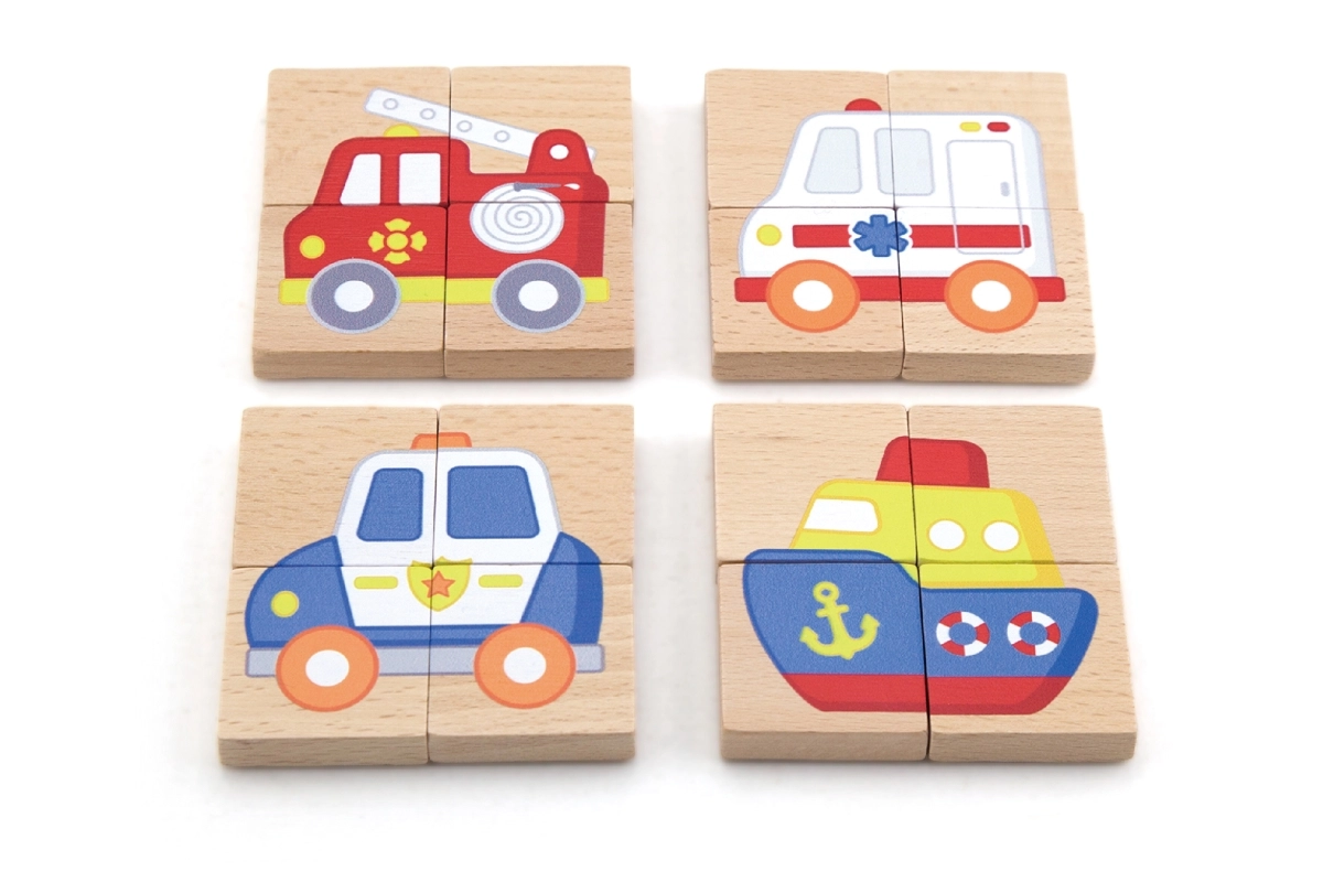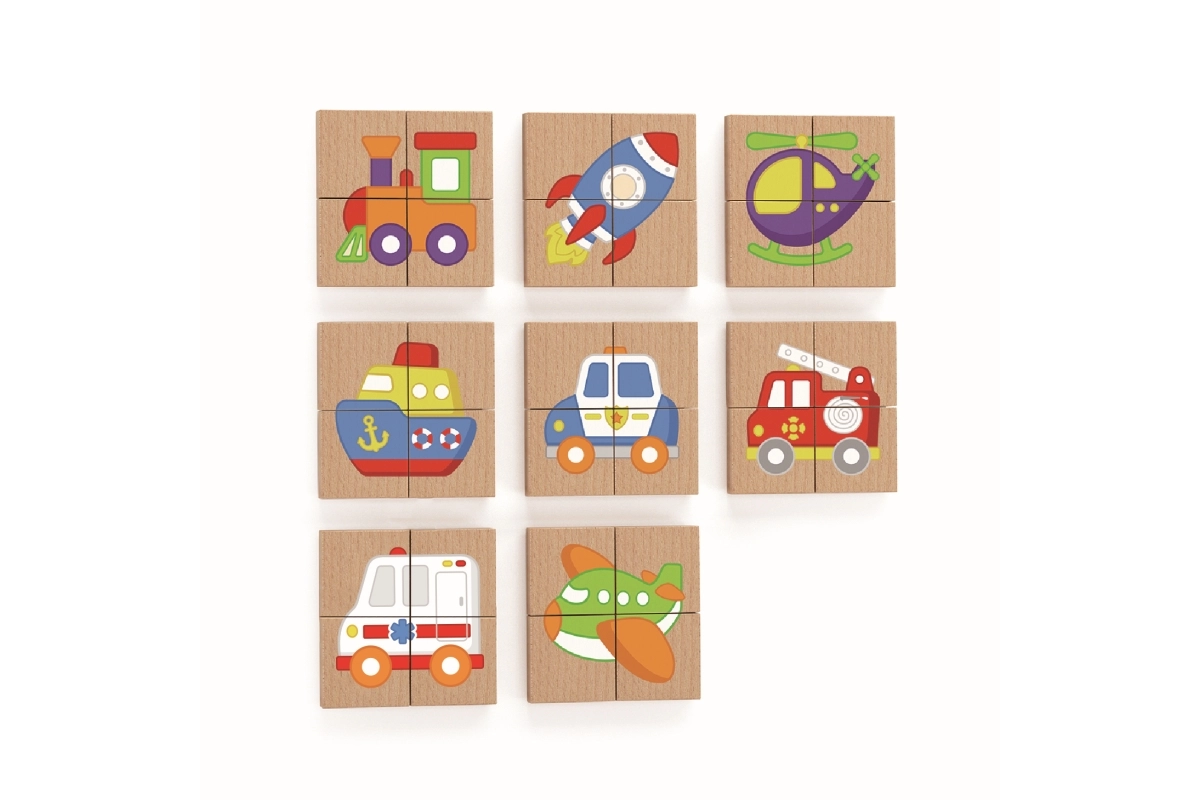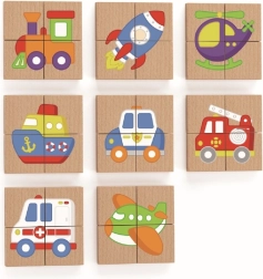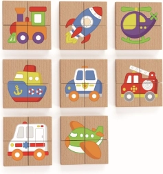 Este rompecabezas ayuda a los niños a desarrollar su pensamiento lógico combinando imágenes de colores para formar medios de transporte completos.