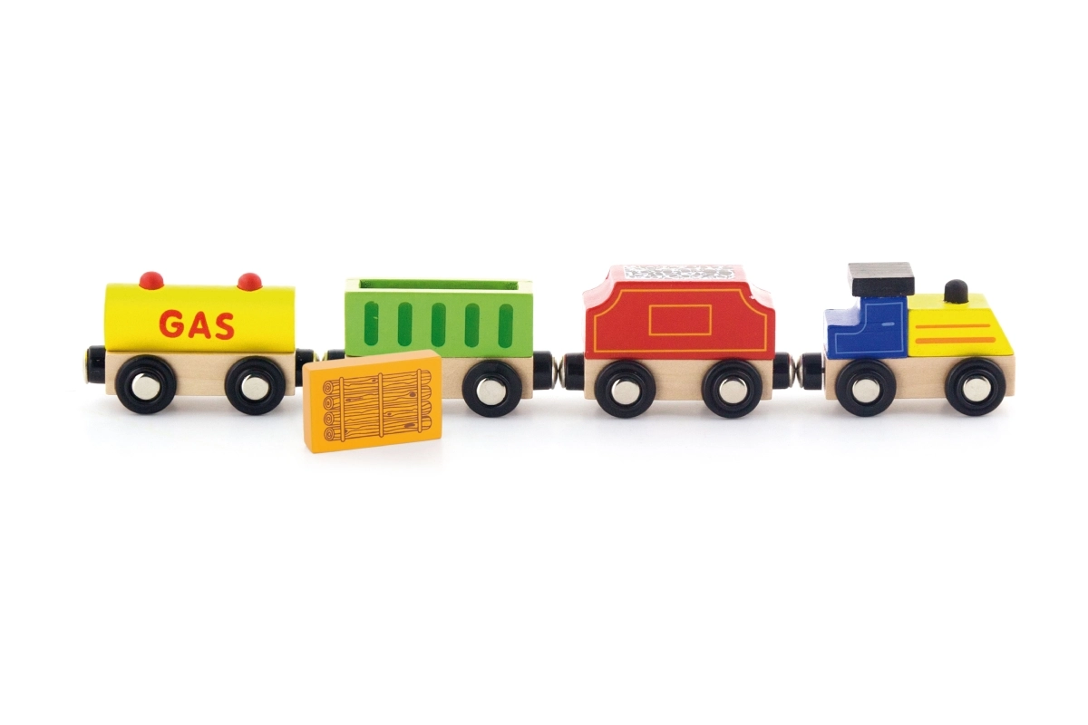 Un complemento ideal para las populares vías de tren de madera: el tren se desliza suavemente y se combina fácilmente con otros sets. Gracias a la temática “energía”, enseña de forma sutil los distintos tipos de carga y ejercita la clasificación, la coordinación y el vocabulario. • Conexión magnética para unir los coches de forma rápida y firme