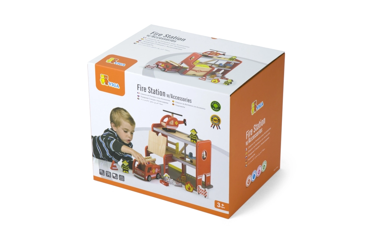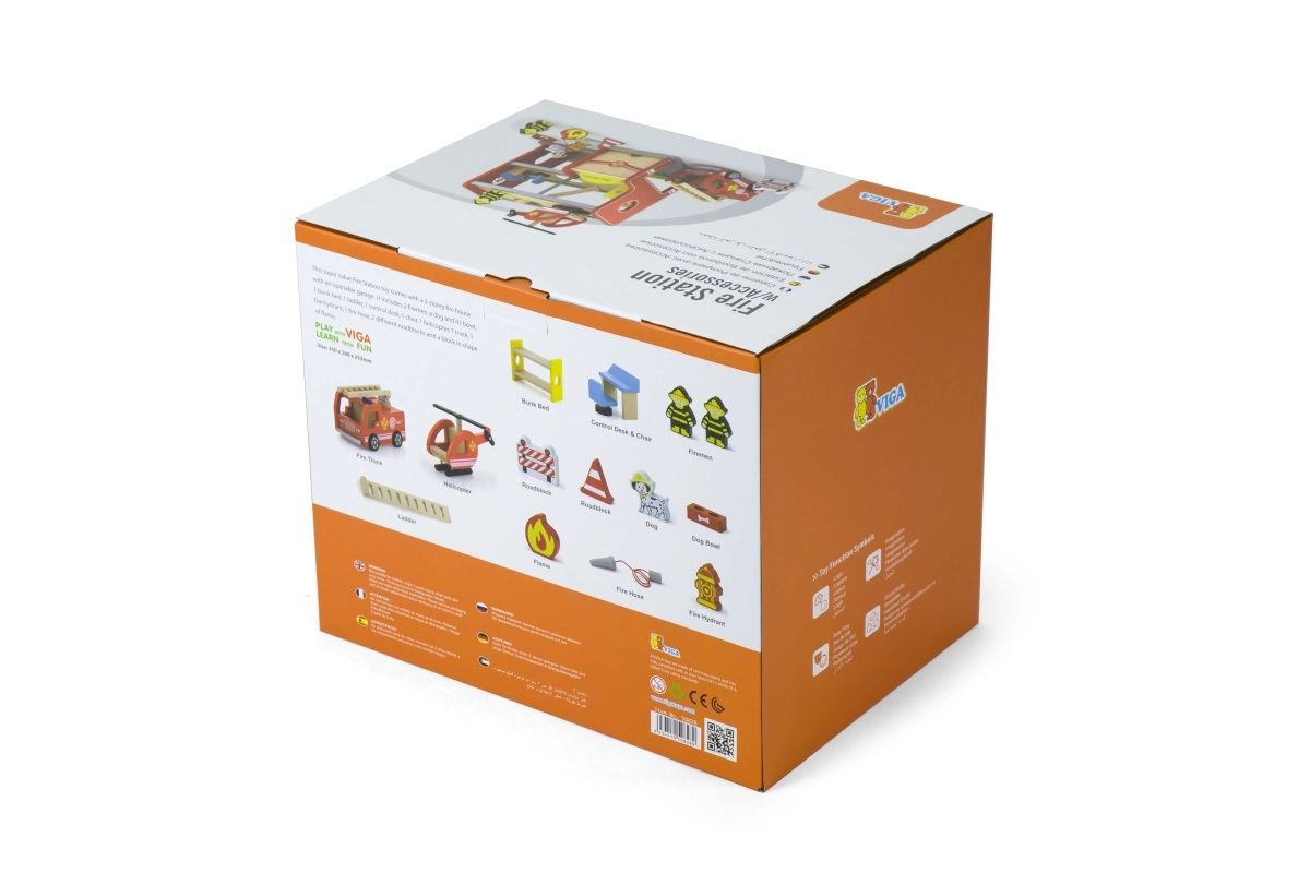 Esta estación de bomberos de madera, ricamente detallada, ofrece a los niños un entorno auténtico para misiones de rescate. Gracias a la estación roja de varios niveles, el camión con escalera y el helipuerto, los niños crean fácilmente sus propias historias y practican la coordinación y el pensamiento lógico.