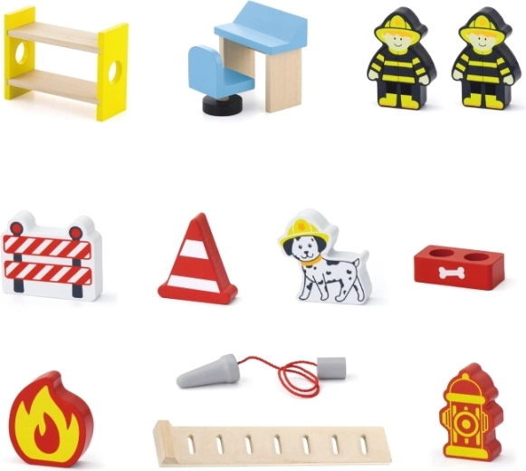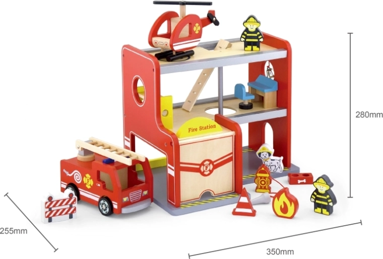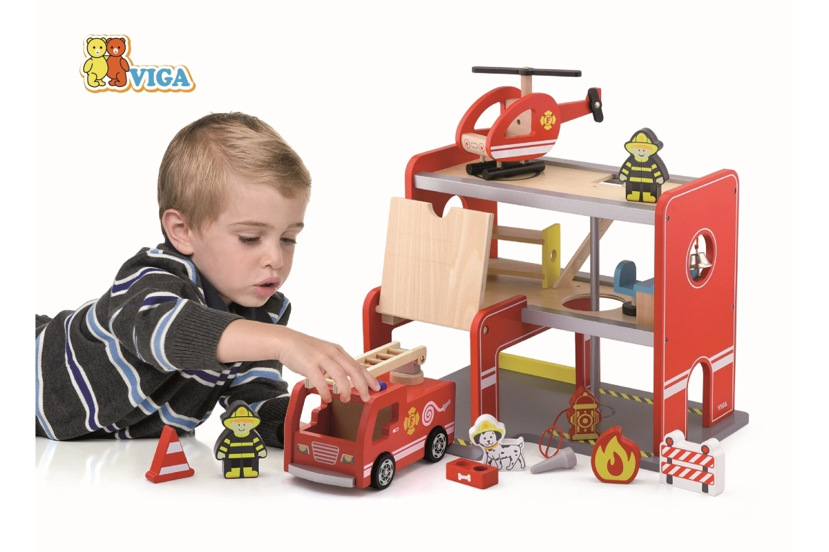 La estación de bomberos de madera Viga es un set de juego completo de varios pisos que fomenta el juego de roles, el desarrollo de la motricidad fina y la imaginación. Los niños pueden salir del garaje con el coche, aterrizar con el helicóptero en la plataforma superior y deslizarse por el tubo directo a la intervención. Los detalles coloridos y la estructura de madera de calidad garantizan un aspecto atractivo y resistencia en el uso diario.
