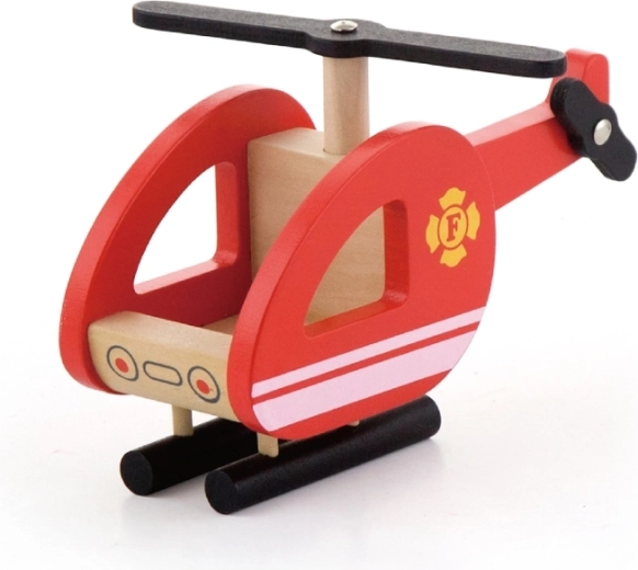 Helicóptero de madera compacto con rotor giratorio y patines estables que complementa cualquier misión de rescate desde el aire.