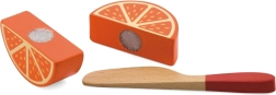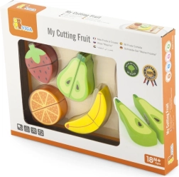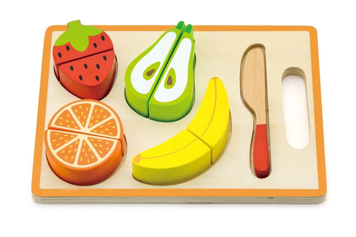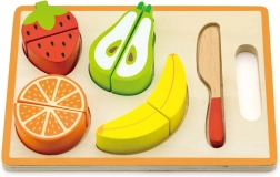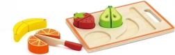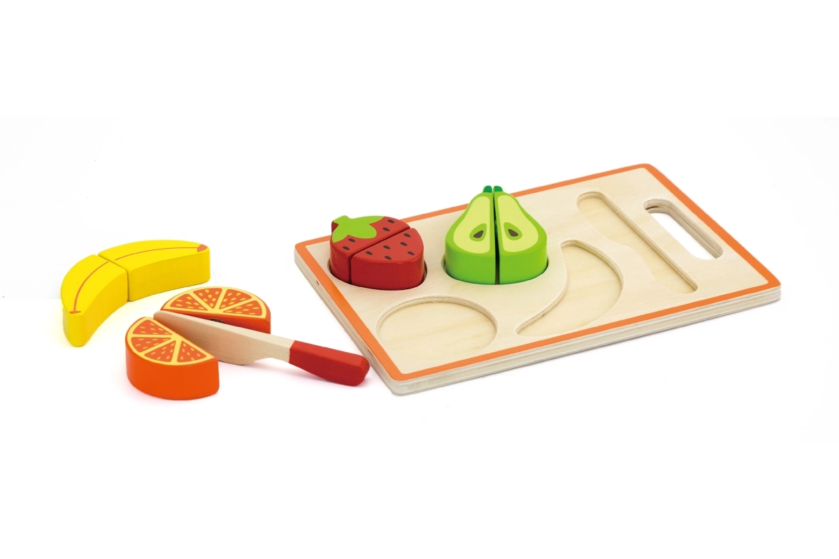 El set incluye una tabla, un cuchillo de madera y diversas frutas de colores que se adaptan perfectamente a las manos de los niños. La construcción robusta de madera y los bordes suaves garantizan una larga durabilidad y un juego seguro.