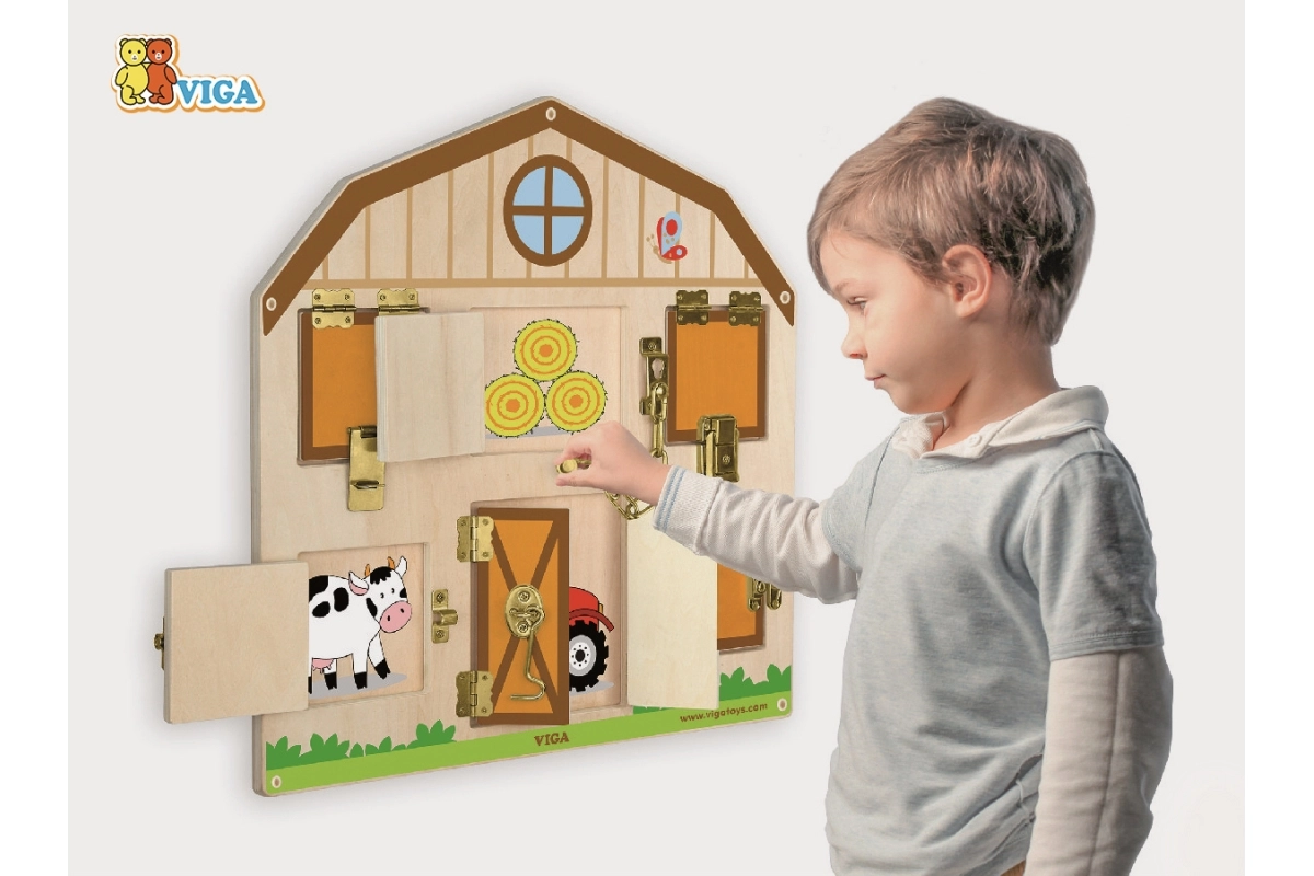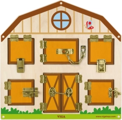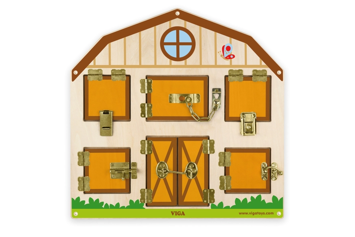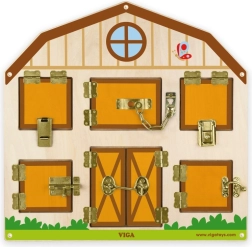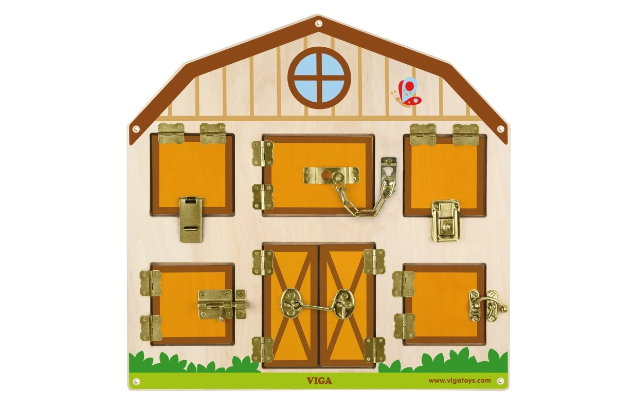 Este juego de madera de calidad con forma de casita ofrece varias puertecitas con diferentes tipos de cierres: ganchos, pestillos, cadenas o correderas. En cada apertura espera una sorpresa en forma de animales ilustrados, lo que fomenta la curiosidad, la concentración y la coordinación óculo-manual.