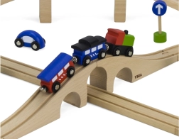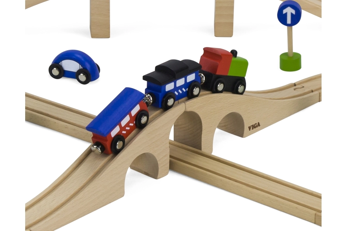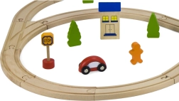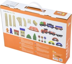 ¡Construye tu propio mundo sobre rieles! La pista de tren de madera, con su longitud total y disposición de vías, permite a los niños crear recorridos variados, superar puentes y conectar el transporte con la ciudad gracias a los cochecitos y accesorios incluidos. La elaboración en madera de calidad es duradera y agradable al agarre.