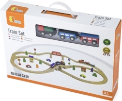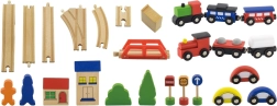 - Vías, 2 × locomotora, 4 × vagón, 3 × cochecito, accesorios (señales, árboles, casitas, etc.)