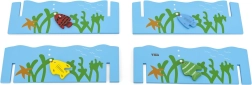 El set incluye una pileta de aproximadamente 35 × 13 × 5 cm, cuatro cañas magnéticas para jugar en grupo y 20 pececitos con números que fomentan la alfabetización matemática temprana y la clasificación. Gracias a las puntas magnéticas, pescar los pececitos es intuitivo y divertido.