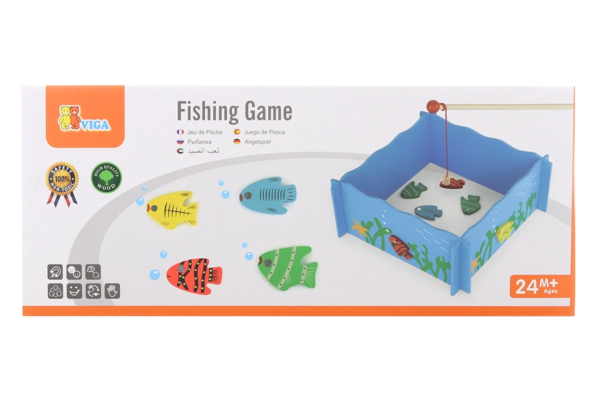 El divertido y de alta calidad juego magnético de pesca de madera desarrolla la motricidad fina, la coordinación ojo–mano y la paciencia de los niños a partir de 24 meses. Incluye una pileta de pesca, 4 cañas magnéticas y 20 pececitos de colores con números para aprender y jugar.