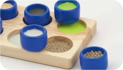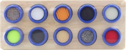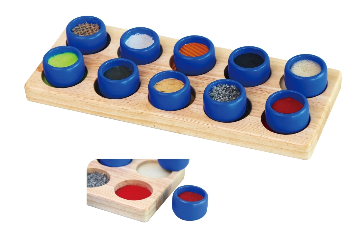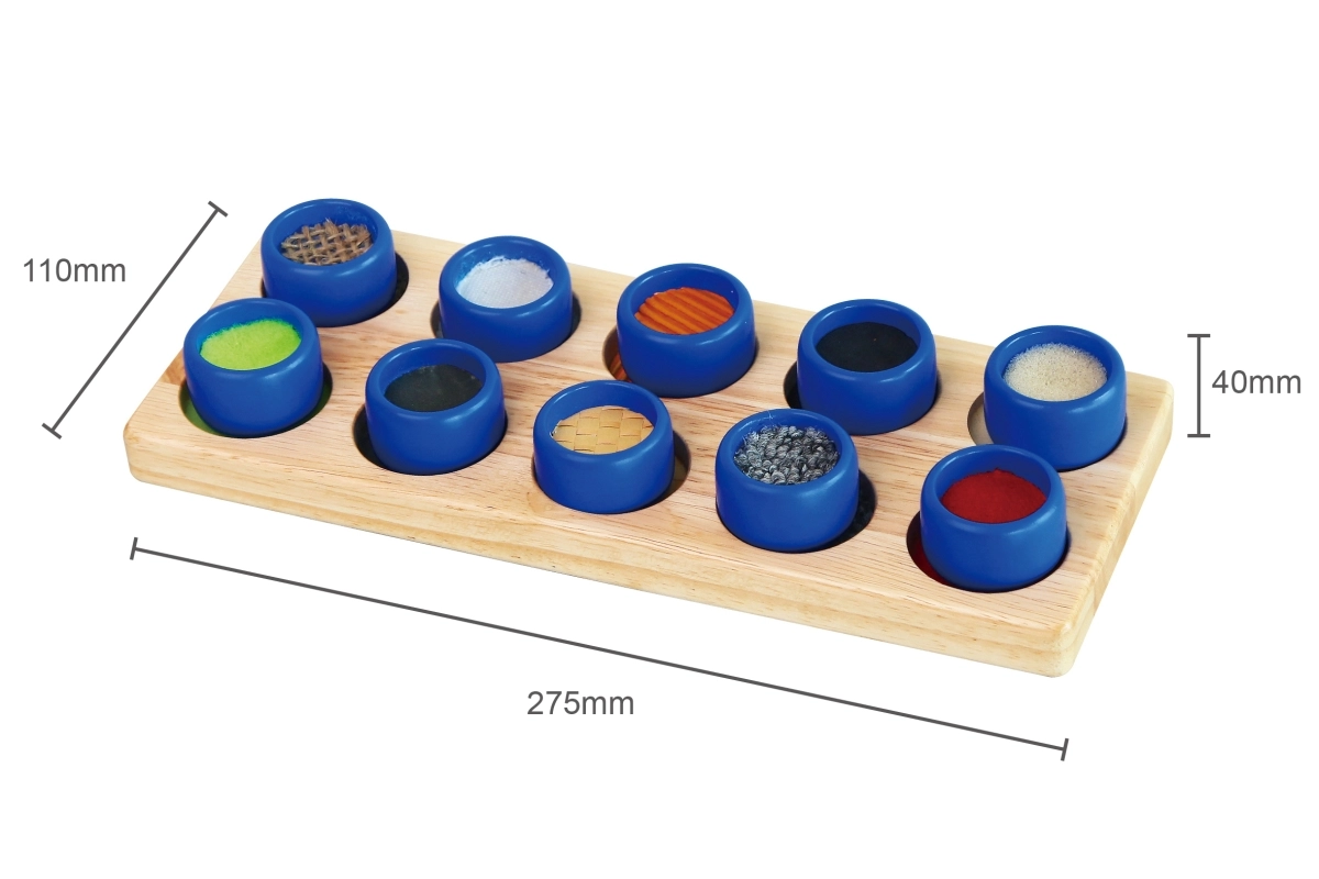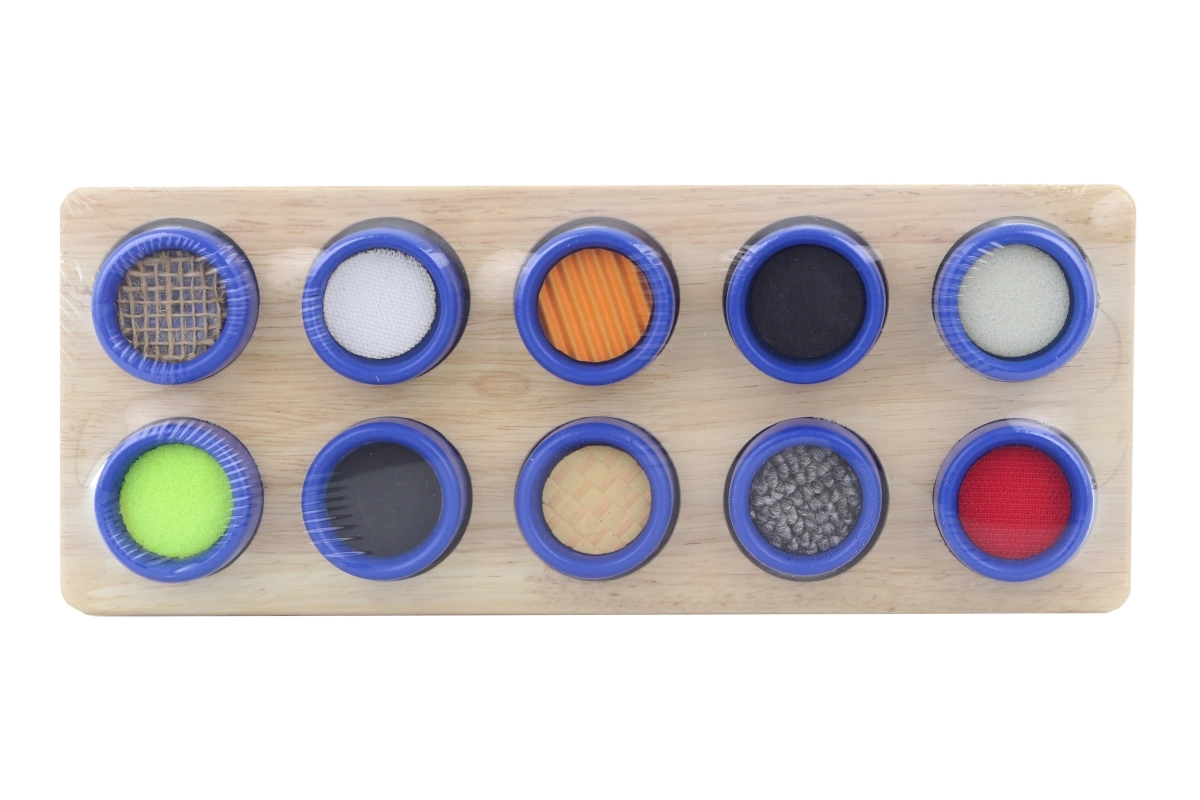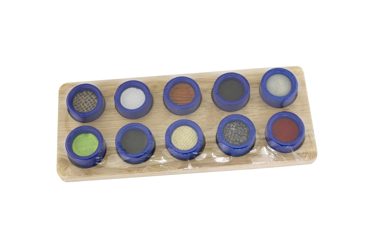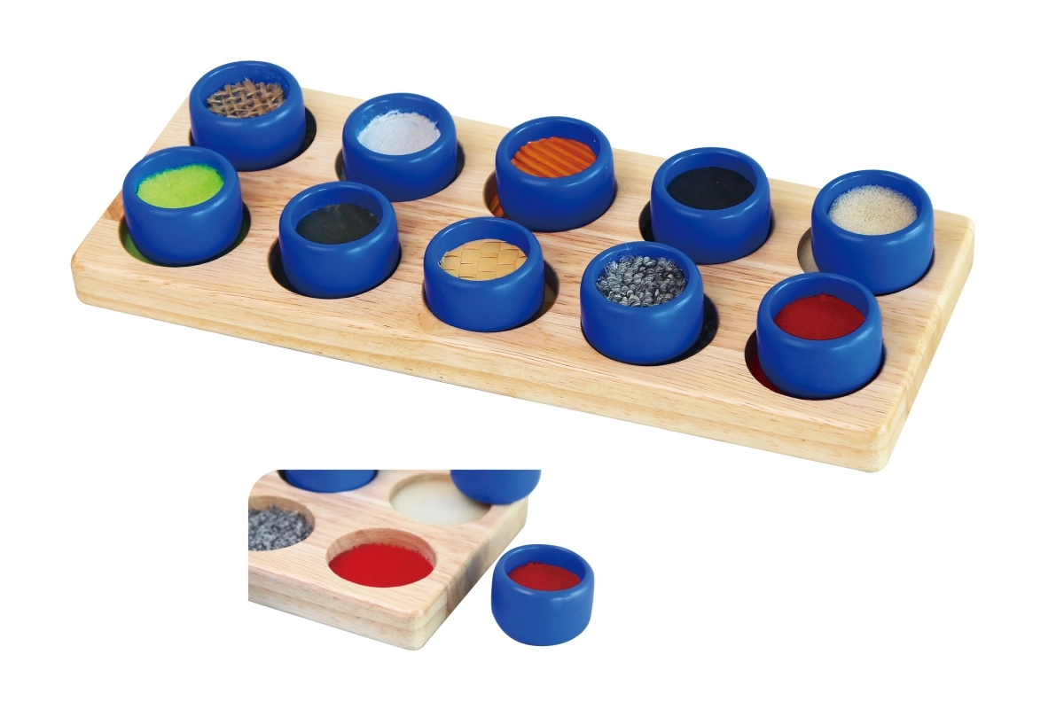 La base y los cilindros ofrecen diez materiales distintos que favorecen el desarrollo de la percepción táctil y de las habilidades cognitivas.
