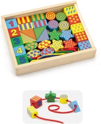 Descubre el juego creativo con el set de ensartar de madera VIGA: una caja llena de formas coloridas para ensartar en cordones como cuentas. Favorece la motricidad fina, la coordinación mano-ojo y el aprendizaje de colores y formas. Piezas de madera de alta calidad con pinturas no tóxicas y tamaño grande para un agarre seguro.