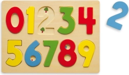 Este rompecabezas numérico de madera ofrece diez piezas de colores con los números 0–9 que se insertan en sus huecos correspondientes. Los niños aprenden de forma natural a reconocer las cifras y practican la paciencia y la concentración.