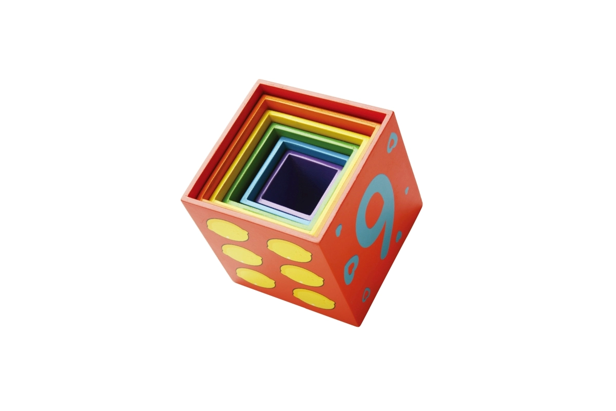 Cada cara del bloque está decorada con distintos motivos, como animales, números, frutas y medios de transporte, que enriquecen la imaginación infantil.