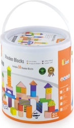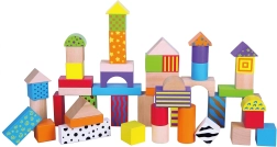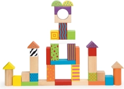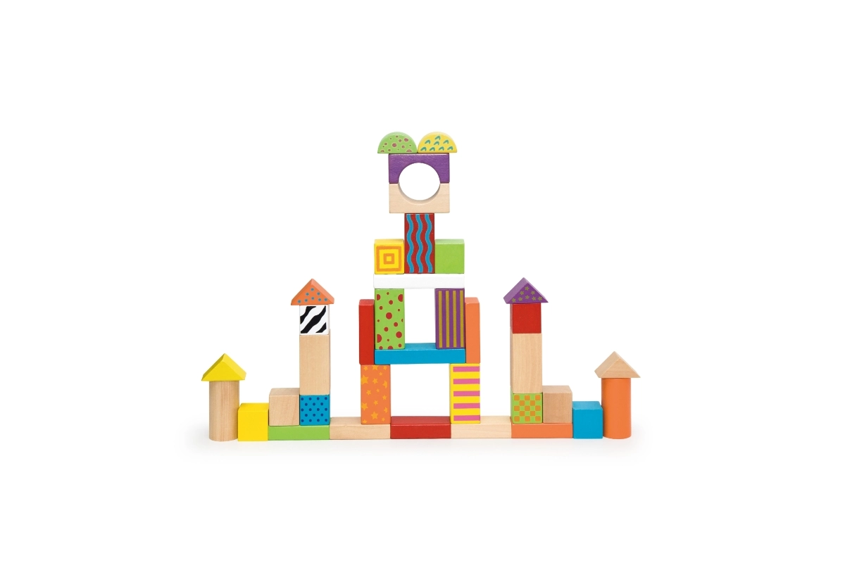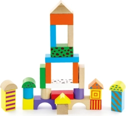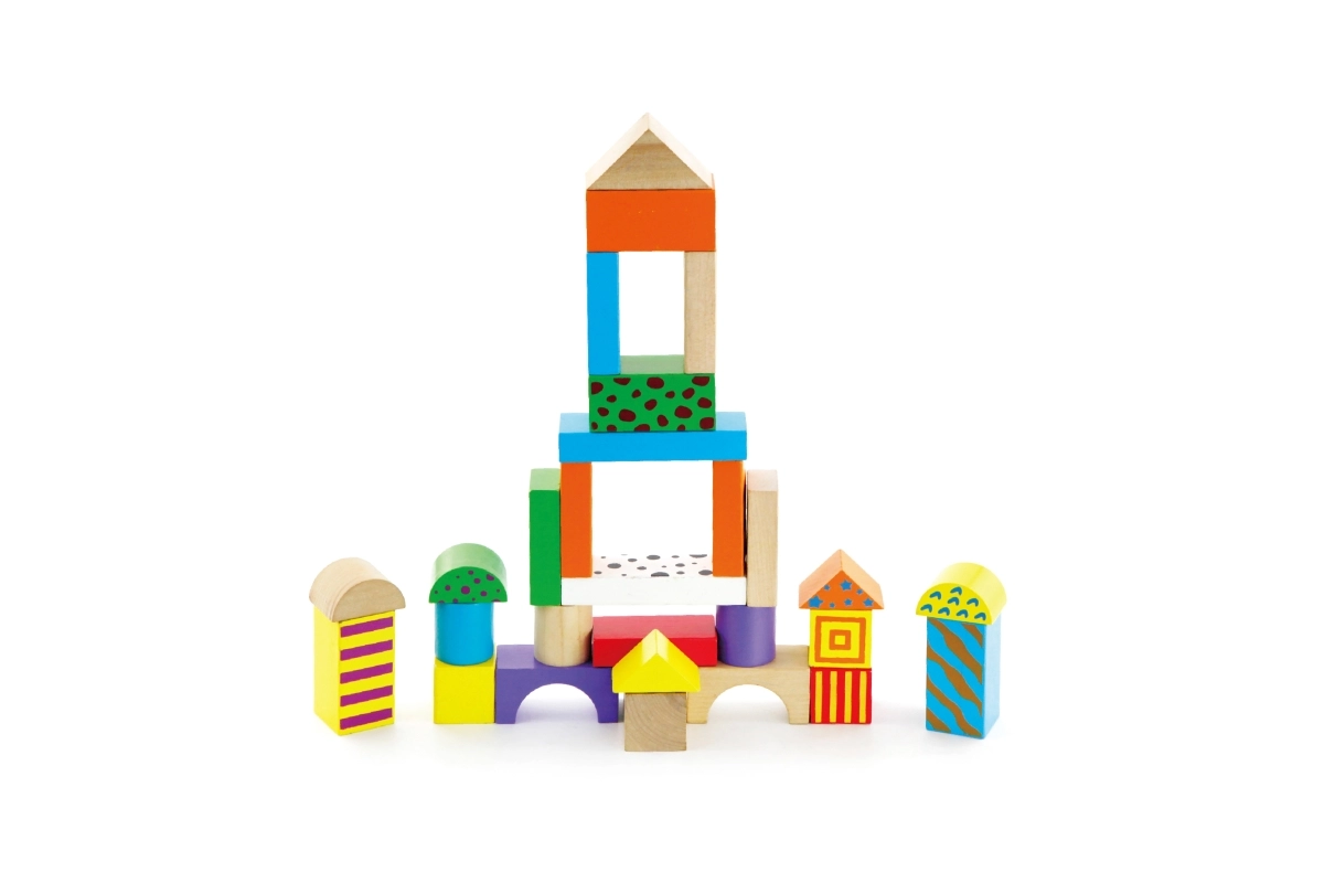 Formas variadas — cubos, cilindros, arcos y tejados — que estimulan la imaginación y favorecen la motricidad fina y la percepción espacial.