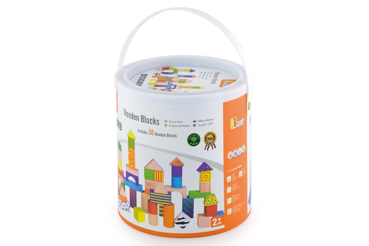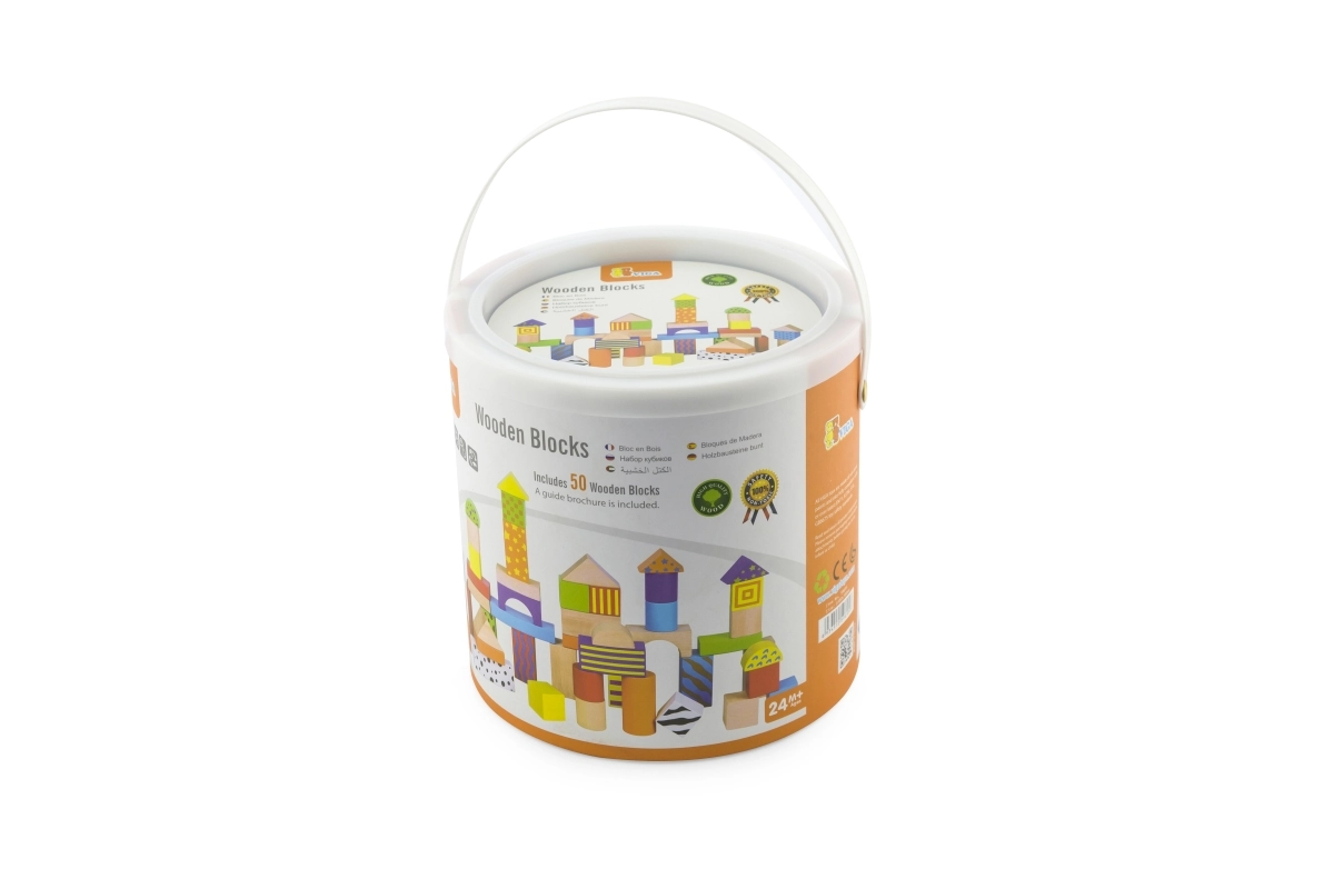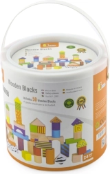 Este versátil set de bloques de madera ofrece a los niños infinitas posibilidades para construir torres, puentes y casitas. Las piezas son agradables al tacto, tienen bordes suaves y están pintadas con colores para un juego atractivo y seguro. El práctico cubo con asa facilita el almacenamiento y el transporte.