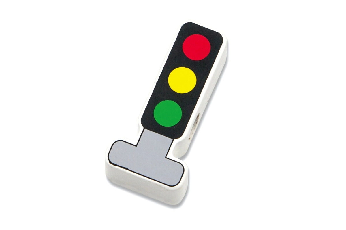 12 piezas y un cordón con varilla de madera permiten ensartar, ordenar y crear historias sobre el tráfico urbano.