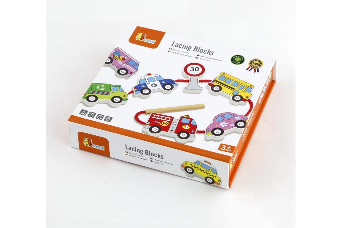 Los niños reconocerán a los bomberos, la policía, el autobús y el taxi, y al ensartar entrenarán los dedos, la concentración y la coordinación mano-ojo.