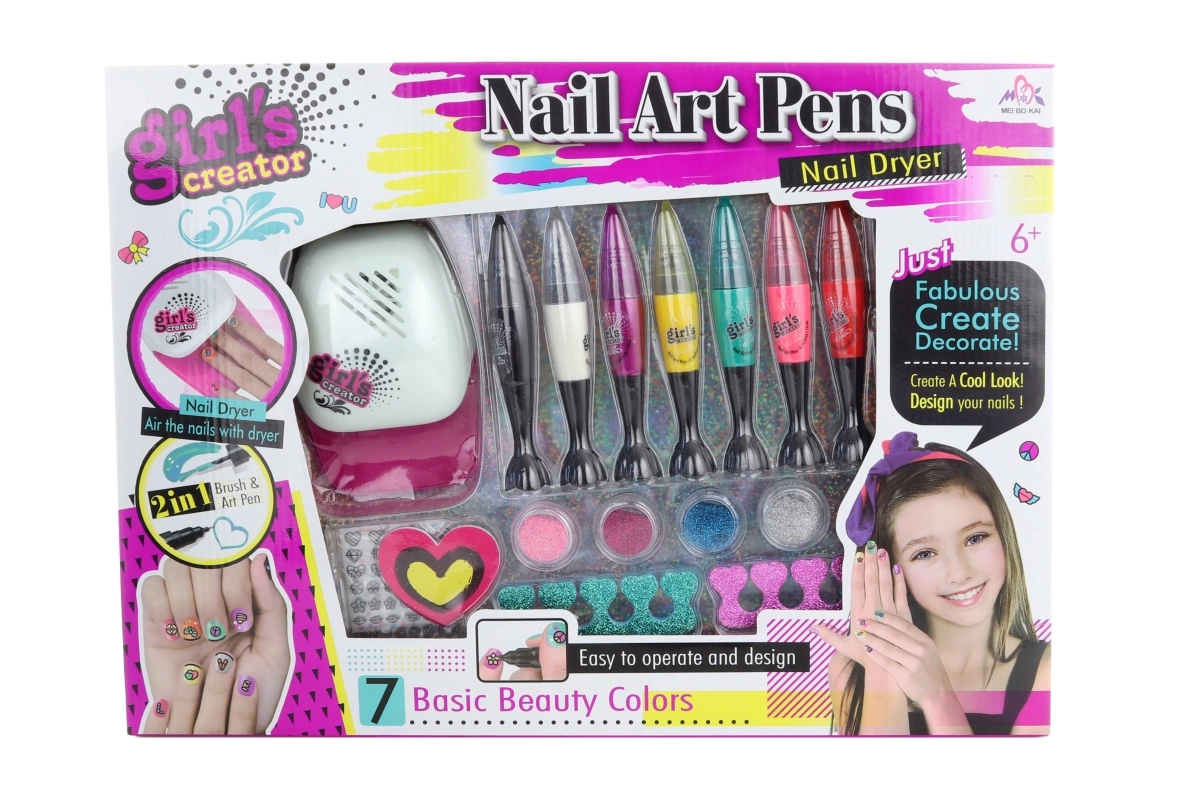 - 7 esmaltes de colores (doble cara: pincel + bolígrafo), secadora de uñas, lima, separadores de dedos, polvos brillantes, pegatinas de colores
