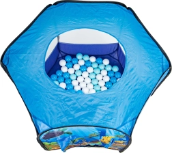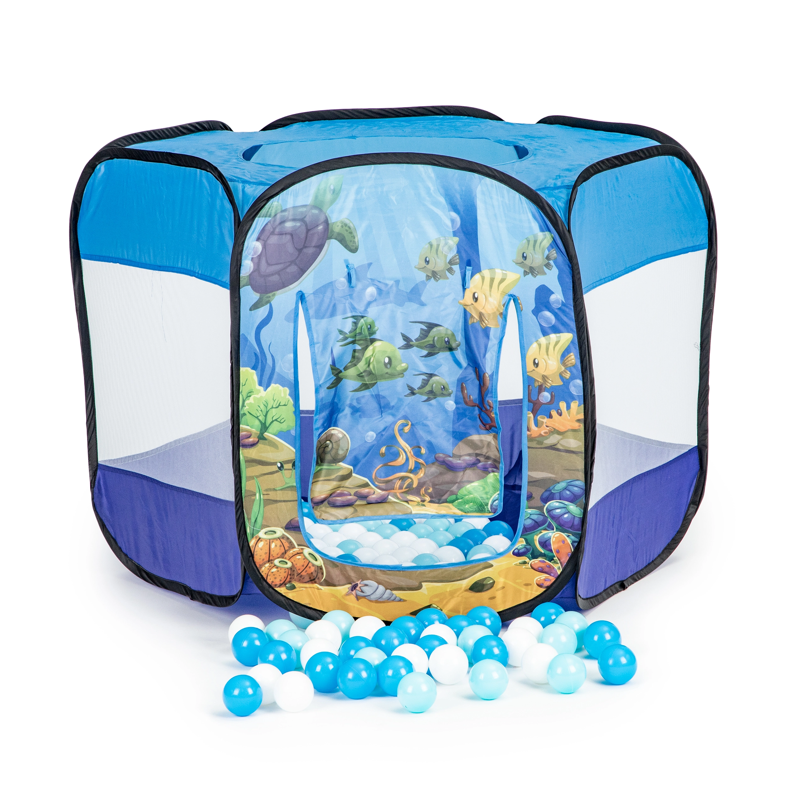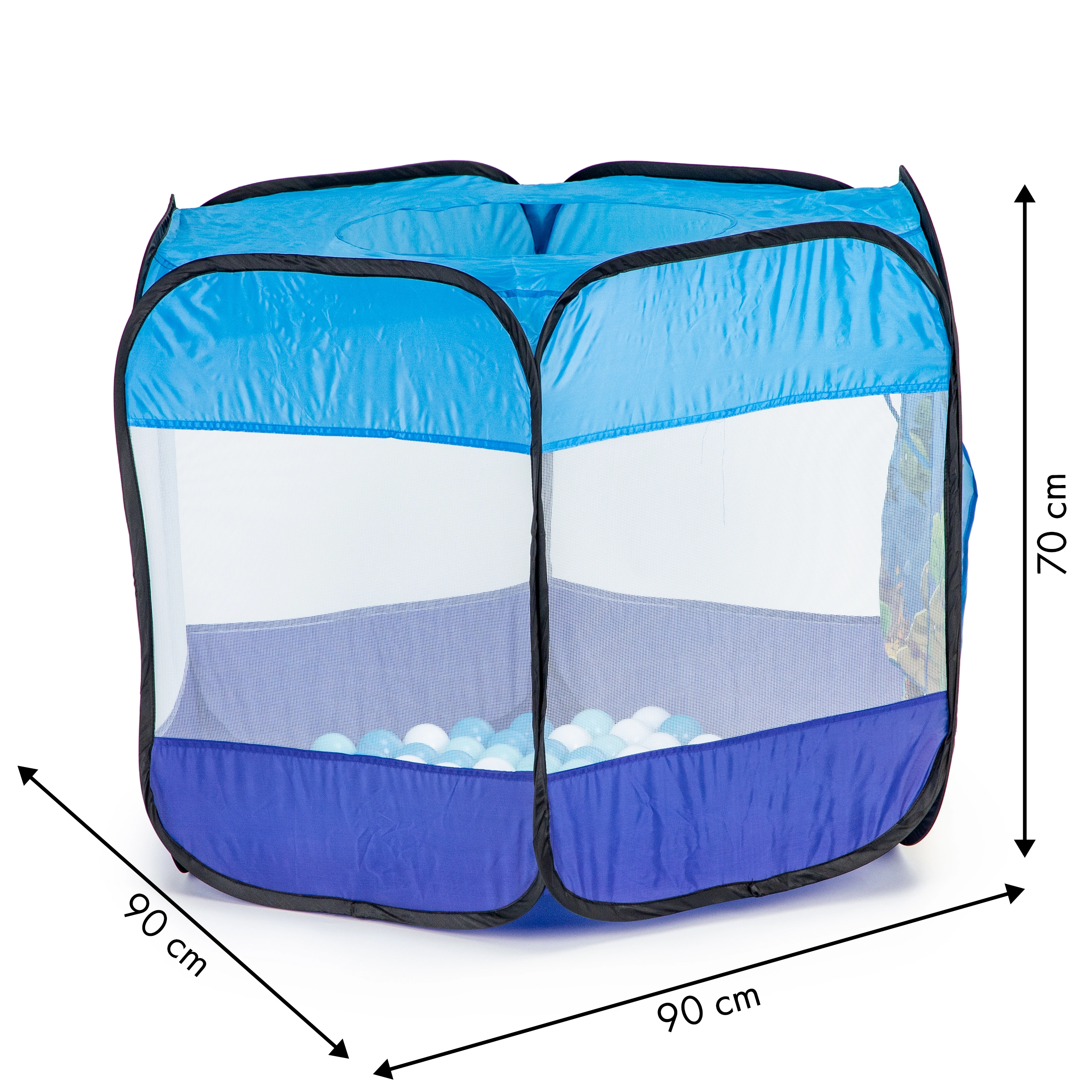 Una carpa emergente ligera y estable para niños con temática del mundo submarino convierte cualquier habitación o jardín en un divertido parque de juegos. Incluye 100 pelotas de colores, paredes de malla transpirables, entrada enrollable y ventana en el techo. La estructura auto desplegable garantiza un montaje rápido y fácil transporte.