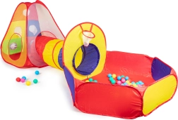 - Set completo: tienda + túnel + piscina seca + 100 bolas + 3 pelotas con velcro