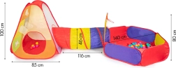 - Tienda, túnel, piscina seca, 100 bolas de plástico, 3 pelotas con velcro