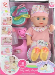 Adorable muñeca para niños a partir de 3 años que, tras insertar las pilas, emite sonidos realistas y puede hacer pis. Incluye un amplio conjunto de accesorios como zapatitos, babero de plástico, biberón y platito. Ideal para practicar el cuidado del bebé y fomentar la imaginación.