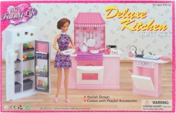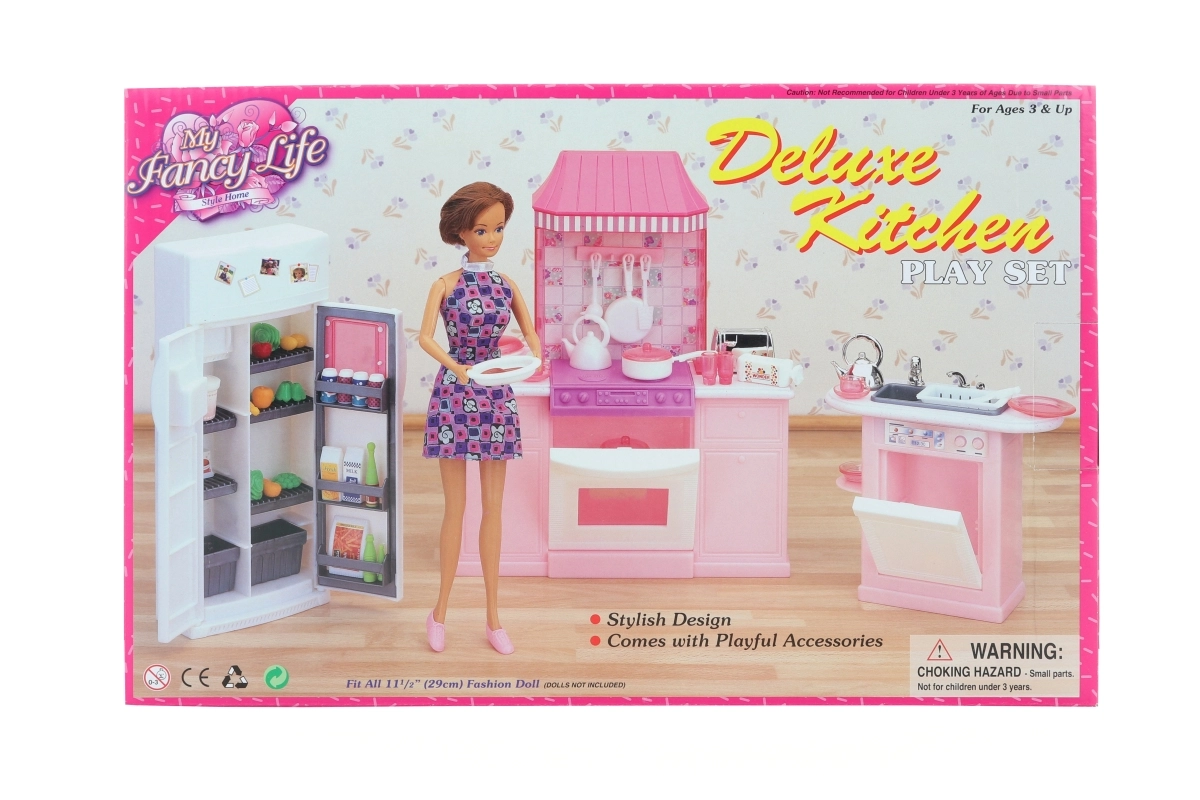 Ofrezca a los niños un juego doméstico realista con el set de cocina de lujo GLORIE, que incluye una encimera de cocina completa con horno, fregadero con lavavajillas y refrigerador con alimentos. También incluye un rico conjunto de accesorios de vajilla. La muñeca no está incluida. Apto para niños a partir de 3 años.