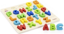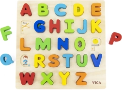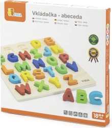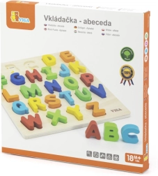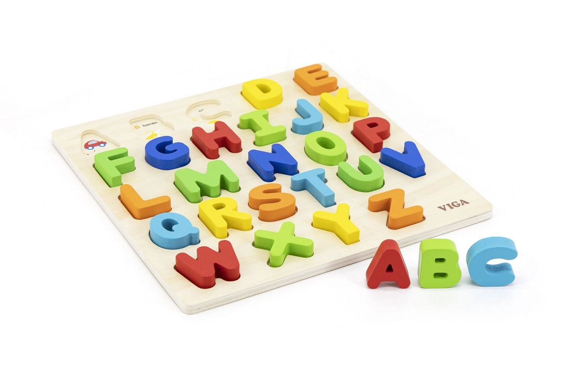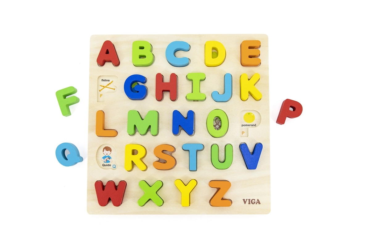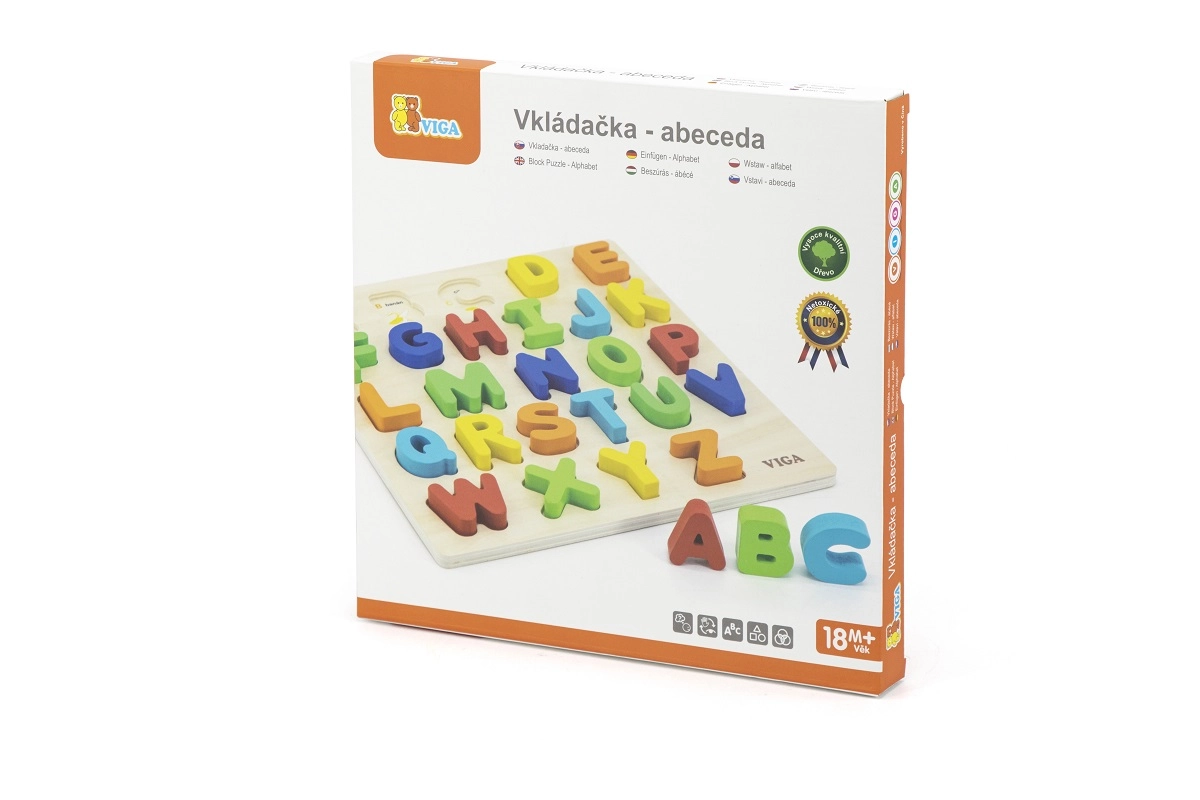 Rompecabezas de madera con letras del alfabeto checo, ideal para niños a partir de 18 meses. Este juguete fomenta el desarrollo de las habilidades motoras y el reconocimiento del alfabeto de forma divertida.