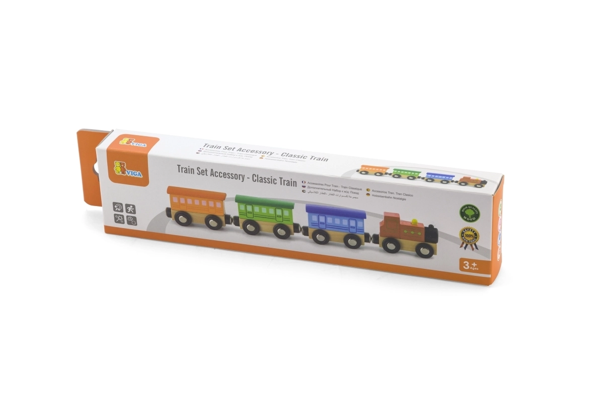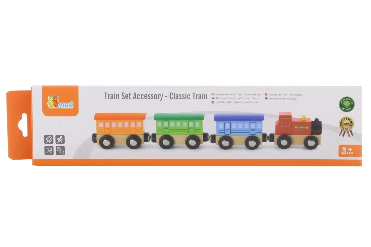 El juego de madera Tren clásico incluye 4 piezas unidas por imanes. Este juguete fue diseñado por el reconocido fabricante de juguetes de madera, Viga Toys. El set puede usarse como juguete independiente o como complemento de otras vías de tren, bloques de construcción y sets.
