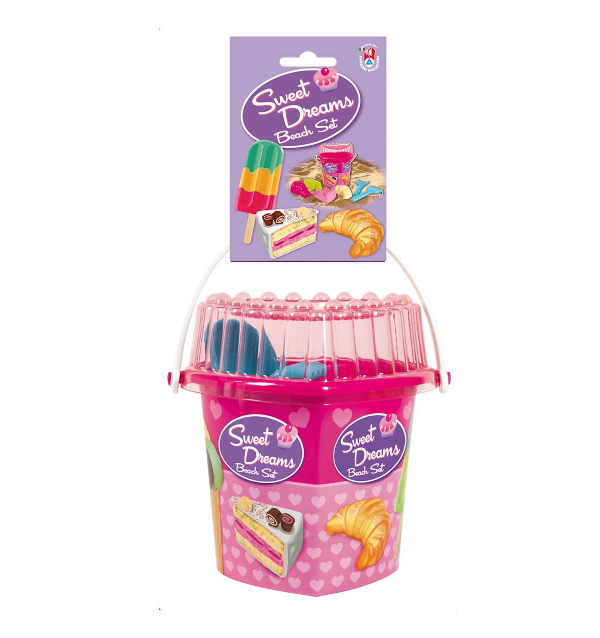- Cubo en forma de corazón con tapa, pala, rastrillo, 4 moldes (helado suave, polo, tarta enrejada, croissant)