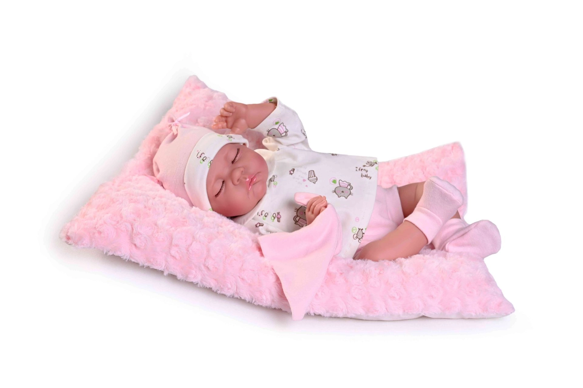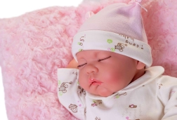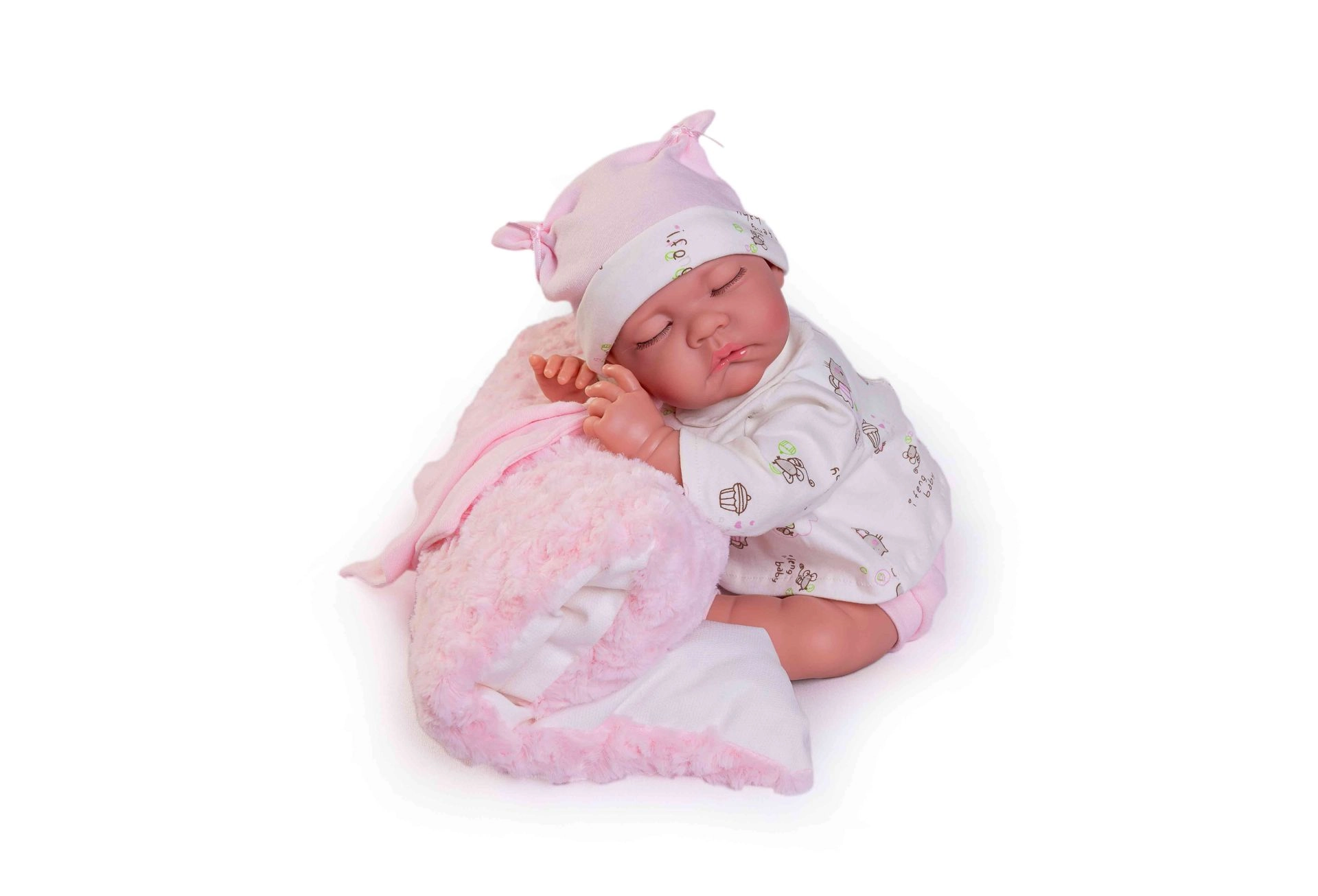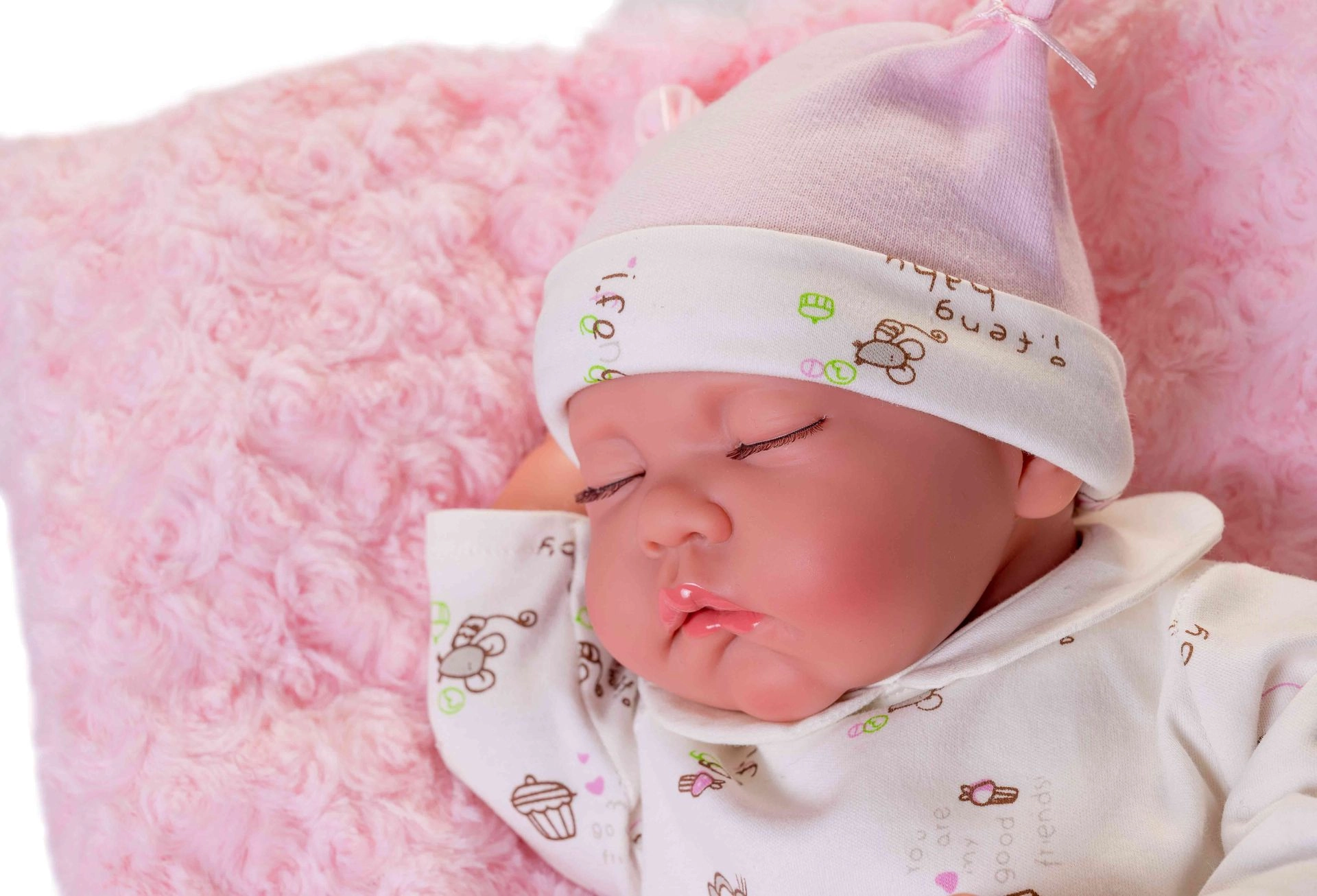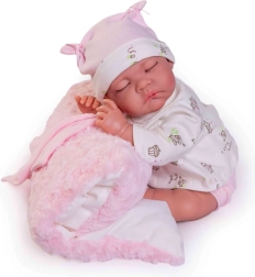 La muñeca Luna parece un bebé dormido real, con rasgos faciales detallados y un cuerpo de vinilo suave y realista, agradable al tacto.
