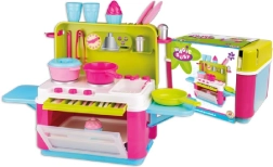 Esta cocina de mostrador es ideal para viajes y para habitaciones infantiles pequeñas. Gracias a sus dos tableros laterales de soporte y extraíbles, ofrece más espacio de juego y, al mismo tiempo, se transporta con facilidad. Incluye horno con bandeja, placa de cocción, fregadero con grifo y un amplio conjunto de utensilios: todo para un juego de cocina realista.