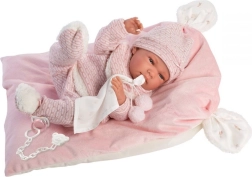La muñeca viste un conjunto de punto rosa con gorrito y botitas para un aspecto realista durante el juego.