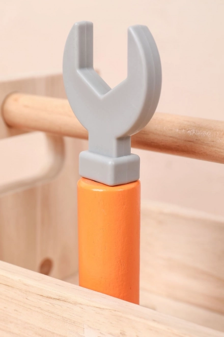 El set incluye una variada selección de herramientas infantiles: martillo, sierra, destornillador, llave, tornillos y tuercas, tornillo de banco y piezas de madera lisas con orificios. Todo tiene su lugar, de modo que los niños aprenden orden y las técnicas básicas de trabajo con elementos de fijación. El juego fomenta las construcciones creativas, la coordinación ojo–mano y la paciencia.