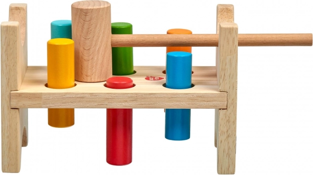 Seis clavijas de colores y un martillo de madera enseñan a los niños el agarre preciso, la fuerza del golpe y la coordinación ojo-mano.