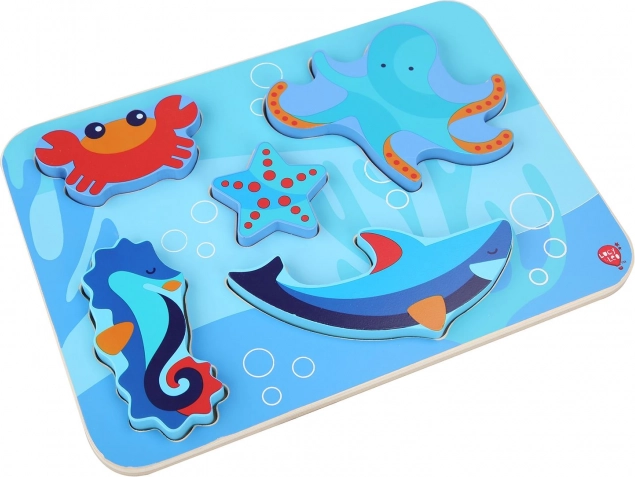 El rompecabezas infantil de madera con temática de animales marinos está diseñado para un aprendizaje divertido. Seis piezas de colores —por ejemplo, pulpo, estrella de mar o caballito de mar— encajan perfectamente en las formas fresadas de la base resistente con motivo oceánico. Las piezas son lo suficientemente grandes para sujetarlas bien y, gracias a su grosor, pueden mantenerse en pie por sí solas.