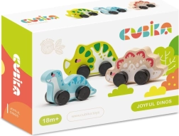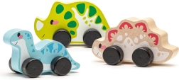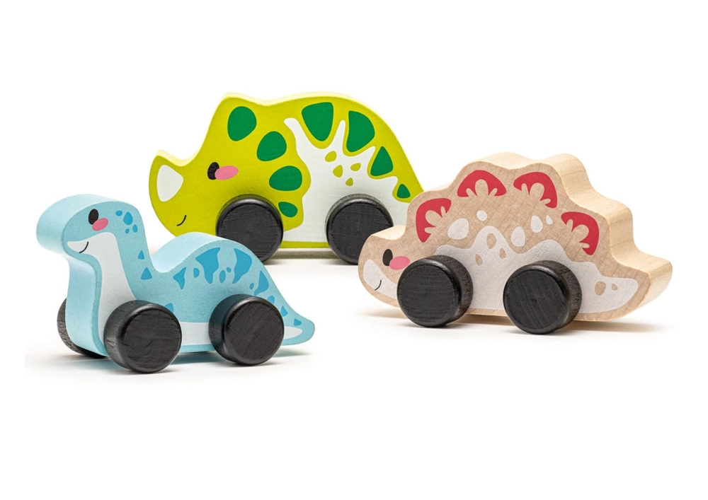 El set incluye tres dinosaurios de madera con ruedas para un movimiento sencillo, ideal para los más pequeños.