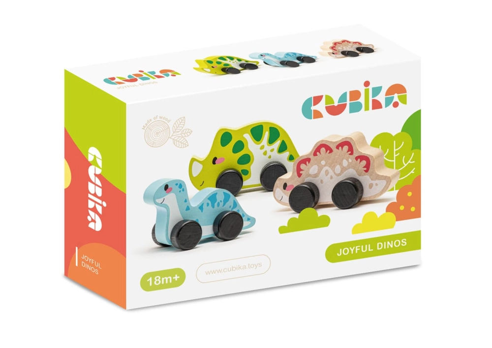 Este set único de tres dinosaurios de madera garantiza horas de diversión para los más pequeños. Gracias a sus cuatro ruedas negras, los dinosaurios se desplazan con facilidad y se convierten en compañeros favoritos de juego. Cada dinosaurio mide aproximadamente 9 x 5 cm y está hecho de madera de arce y haya de alta calidad. Las pinturas al agua utilizadas son completamente seguras para los niños y no tienen olor.