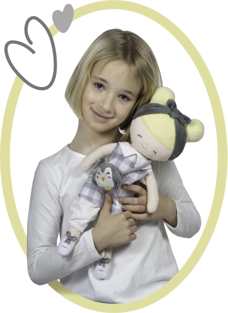 Muñeca de peluche Pipo es una adorable compañera infantil con su pingüino de peluche, ideal para cualquier niña pequeña. Destaca por su felpa de alta calidad, muy suave, y por ser lavable.
