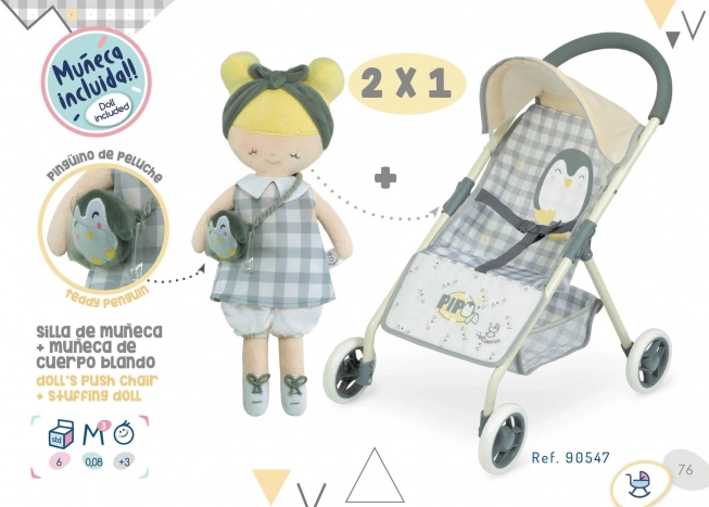 DeCuevas Cochecito deportivo para muñecas con muñeca de peluche PIPO 2022 forma parte de la nueva colección de 2022, que aporta accesorios de calidad y con estilo para las futuras amas de casa. Este cochecito se caracteriza por su elegante diseño español y su fabricación precisa. Es fácil de manejar, algo que apreciarás tanto durante el juego como al guardarlo.