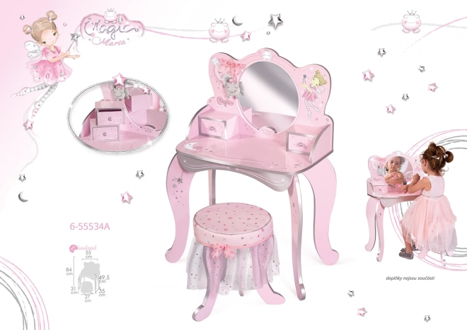 Este tocador de madera, inspirado en los cuentos, es el complemento ideal para cualquier dormitorio de niña. Está decorado con hermosos estampados e incluye