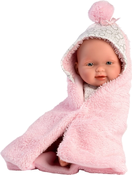 Este conjunto de dos piezas está diseñado especialmente para la muñeca bebé New Born de 26 cm. Incluye una mantita reversible con capucha que protege a la muñeca y le da el aspecto de un bebé real.