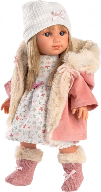 Con atención al detalle y a la calidad, la muñeca Elena viste un abrigo rosa con cuello de pelo y un vestido blanco con estampado floral.