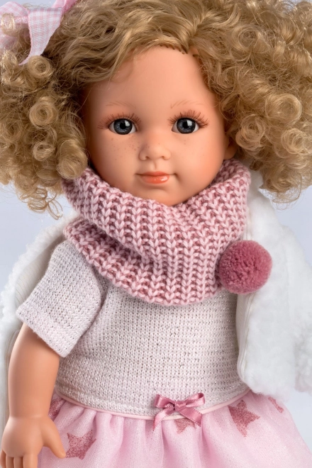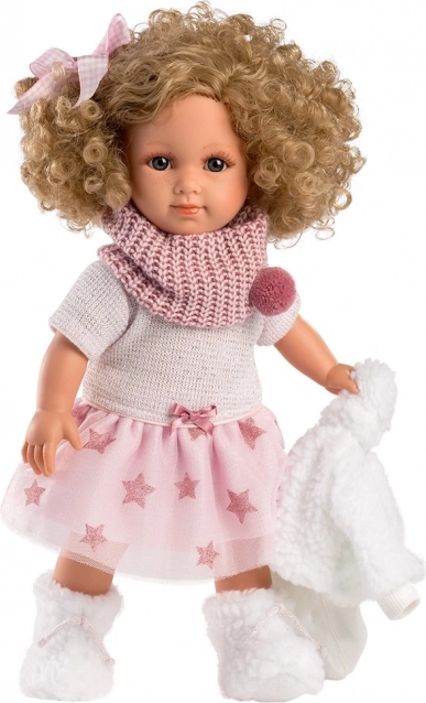 La muñeca Elena viste un vestido de moda con patrón de estrellas, una bufanda con pompón y zapatos blancos, lo que le aporta un aspecto único.