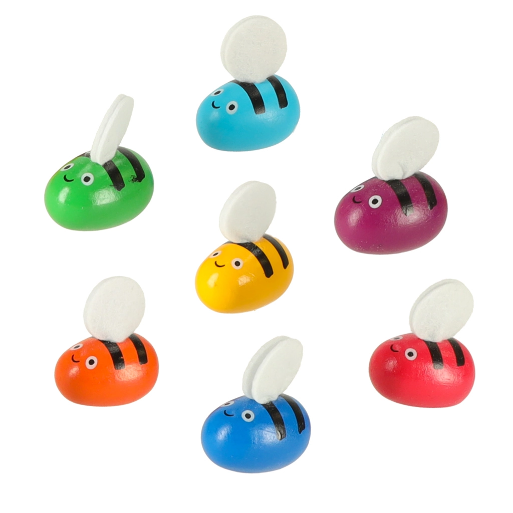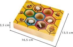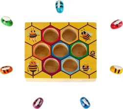 El juego educativo Panal de abejas Montessori fomenta el desarrollo de las habilidades motoras y la autonomía de los niños. Incluye una base de madera maciza y siete abejitas de colores que los niños colocan en los orificios correspondientes con la pinza de plástico roja incluida.