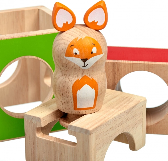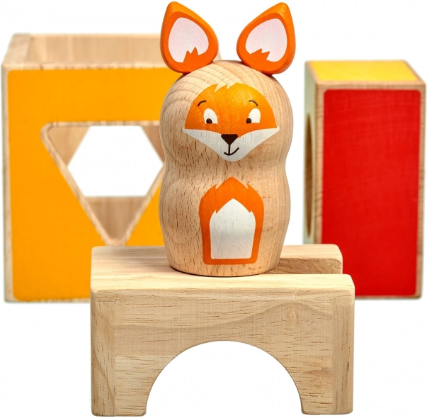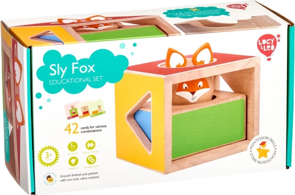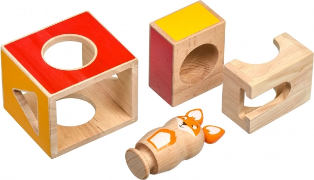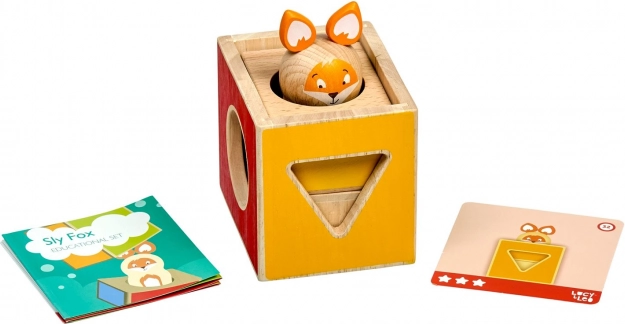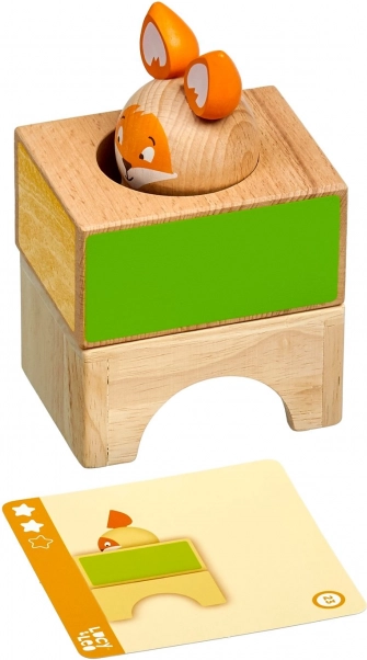 Este juego educativo de madera incluye tres bloques macizos con recortes de distintas formas, una figura de madera de una zorra y un conjunto de cartas de tareas de doble cara con diferentes niveles de dificultad. Siguiendo las plantillas, los niños construyen y combinan los bloques para que la zorra se “esconda” correctamente, entrenando así la estrategia y la percepción espacial.