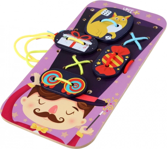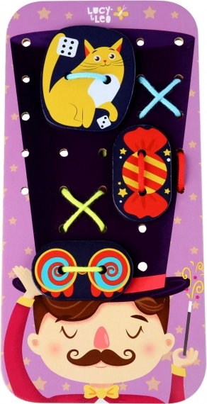 Este divertido set de enhebrado con temática de mago invita a los niños a un mundo de fantasía. En la gran base con la cabeza del mago y su sombrero, pueden fijar coloridos accesorios con ayuda de los cordones: desde un conejo y monedas hasta misteriosas cartas. Al jugar, los niños practican la coordinación ojo-mano, la paciencia y la creatividad.